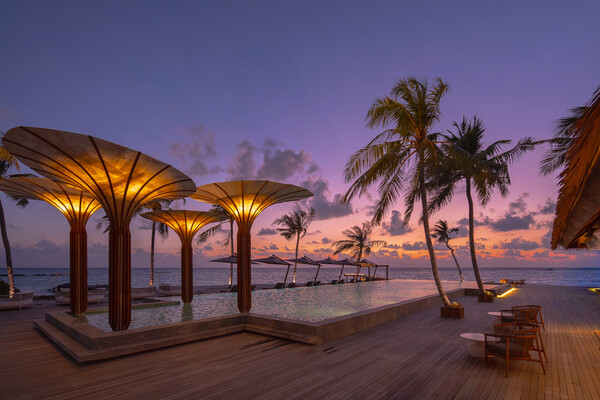 투명한 바닥 수영장에서 몰디브의 환상적인 일몰을 감상할 수 있습니다.