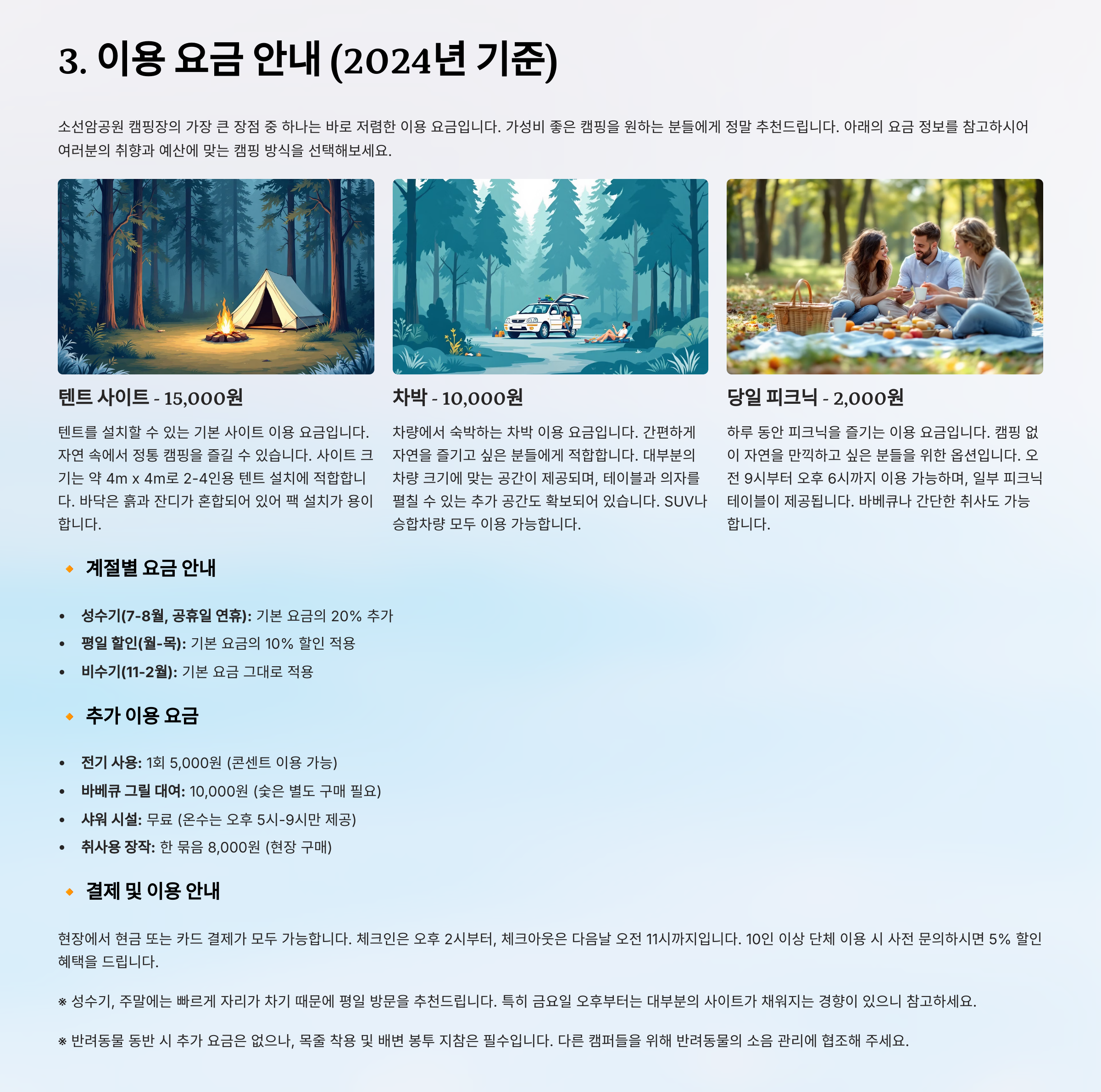 - 캠핑장 (텐트 사이트) : 15,000원
