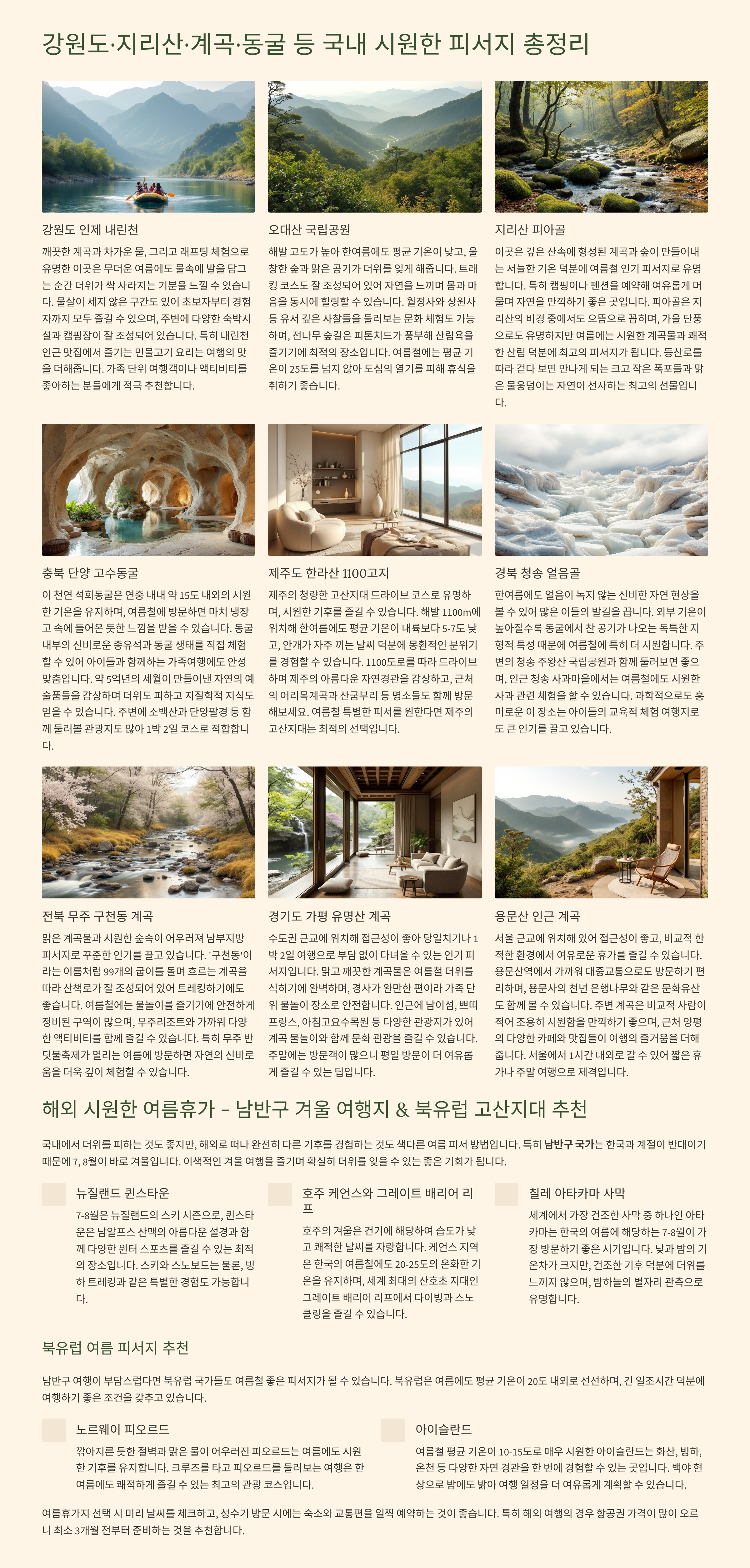 국내는 물론 해외의 시원한 피서지를 미리 알아두면 보다 똑똑하고 효율적으로 여름휴가를 준비할 수 있습니다.