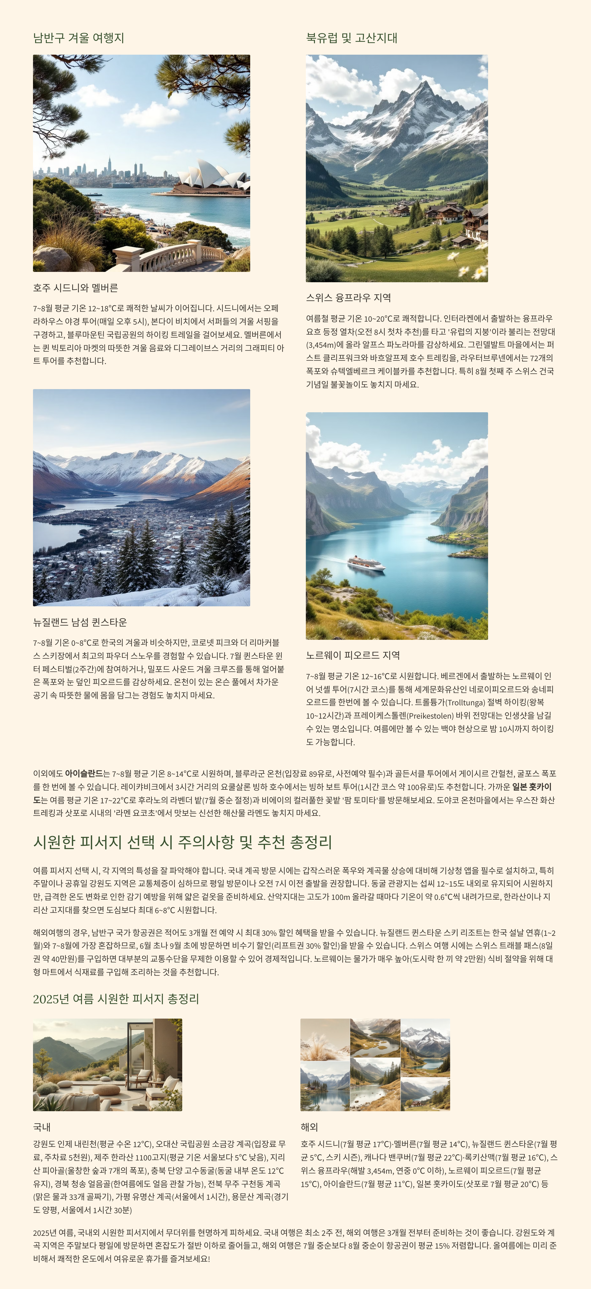✅ 해외: 호주 시드니·멜버른, 뉴질랜드 퀸스타운, 캐나다 밴쿠버·록키산맥, 스위스 융프라우, 노르웨이 피오르드, 아이슬란드, 일본 홋카이도 등