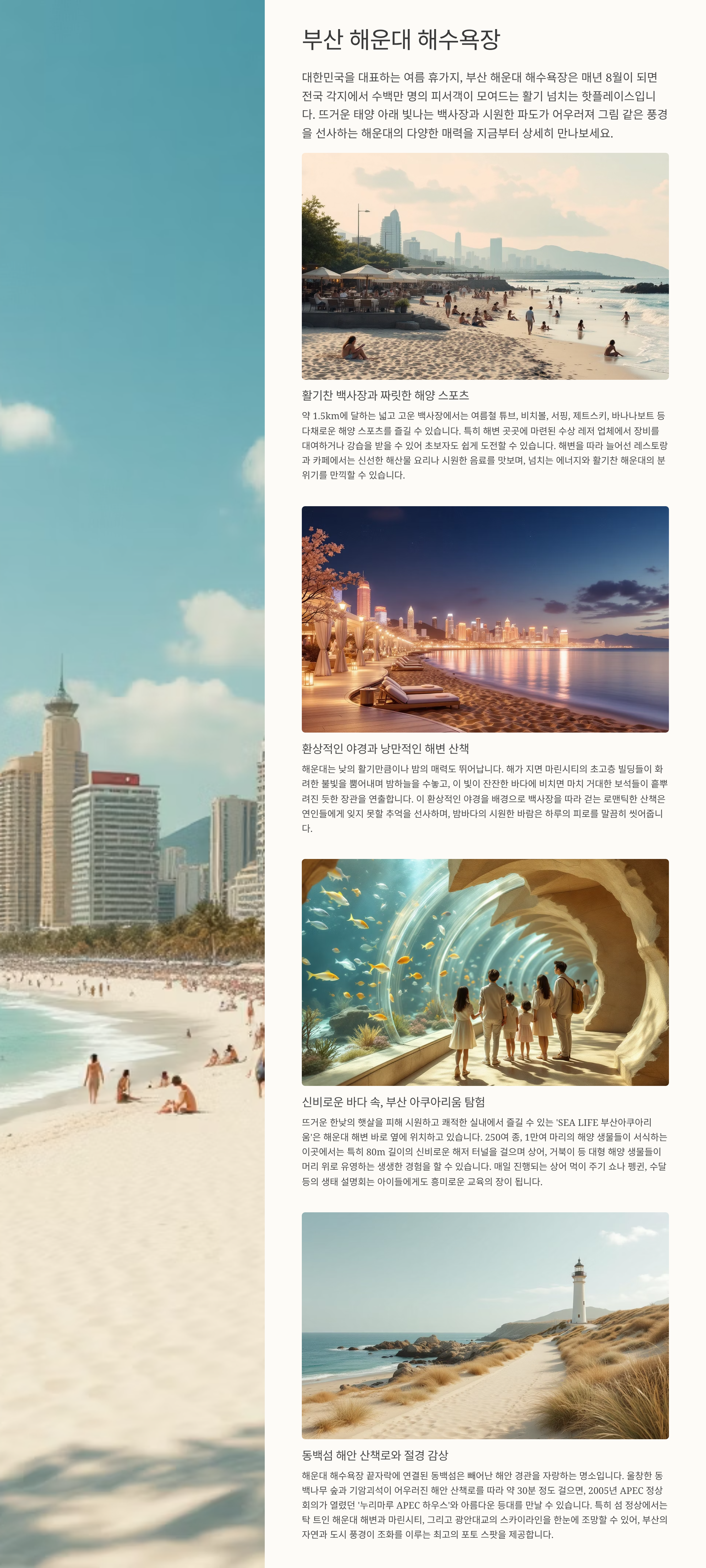 넓은 백사장, 각종 해양 스포츠, 해변가 레스토랑 등 즐길 거리가 풍성하며, 밤에는 해운대 마린시티의 야경을 감상하며 로맨틱한