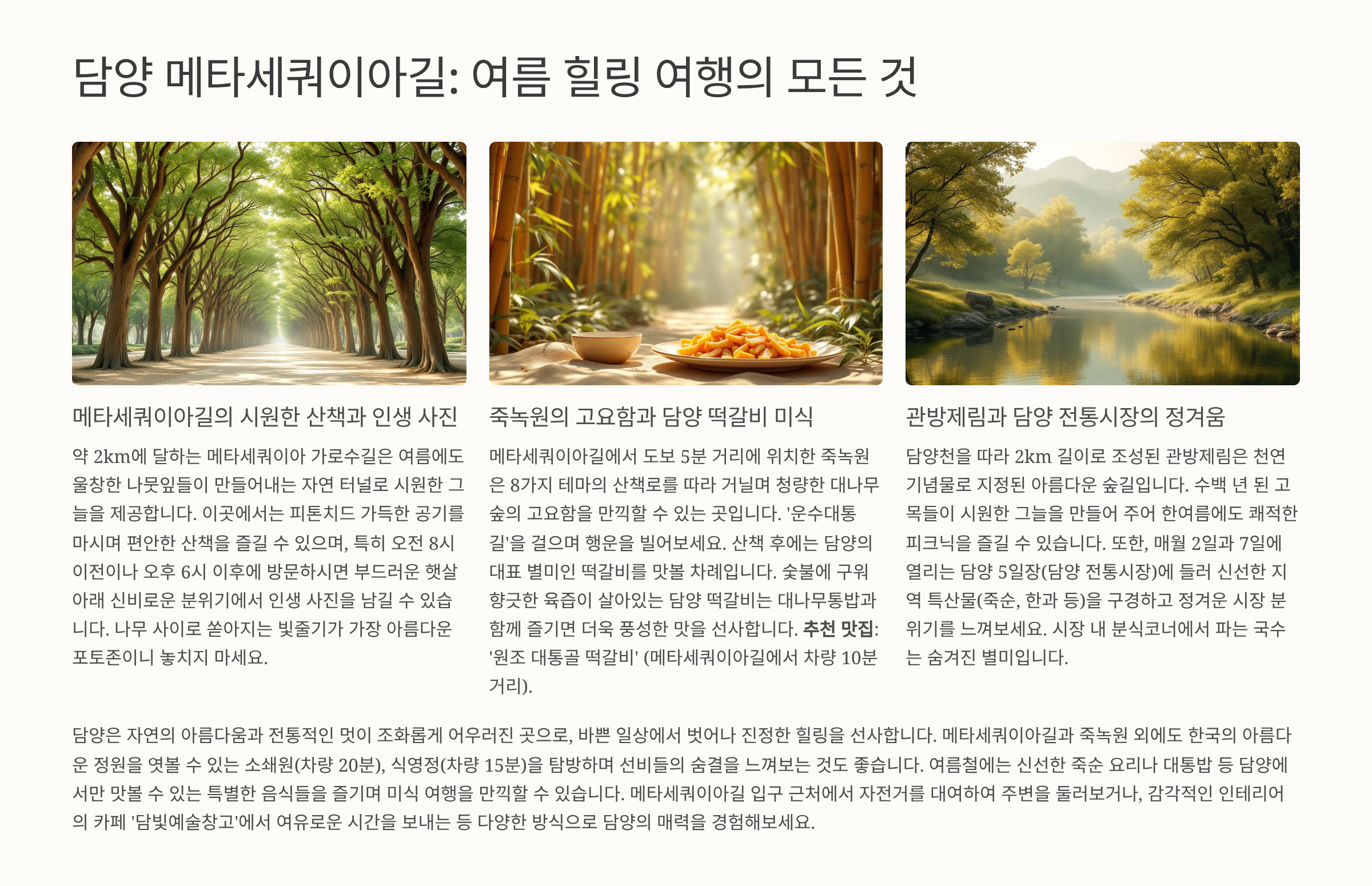 여름에도 나무들이 만든 그늘 덕분에 시원하게 산책할 수 있으며, 담양의 대표 관광지로 사진 명소로도 유명합니다.