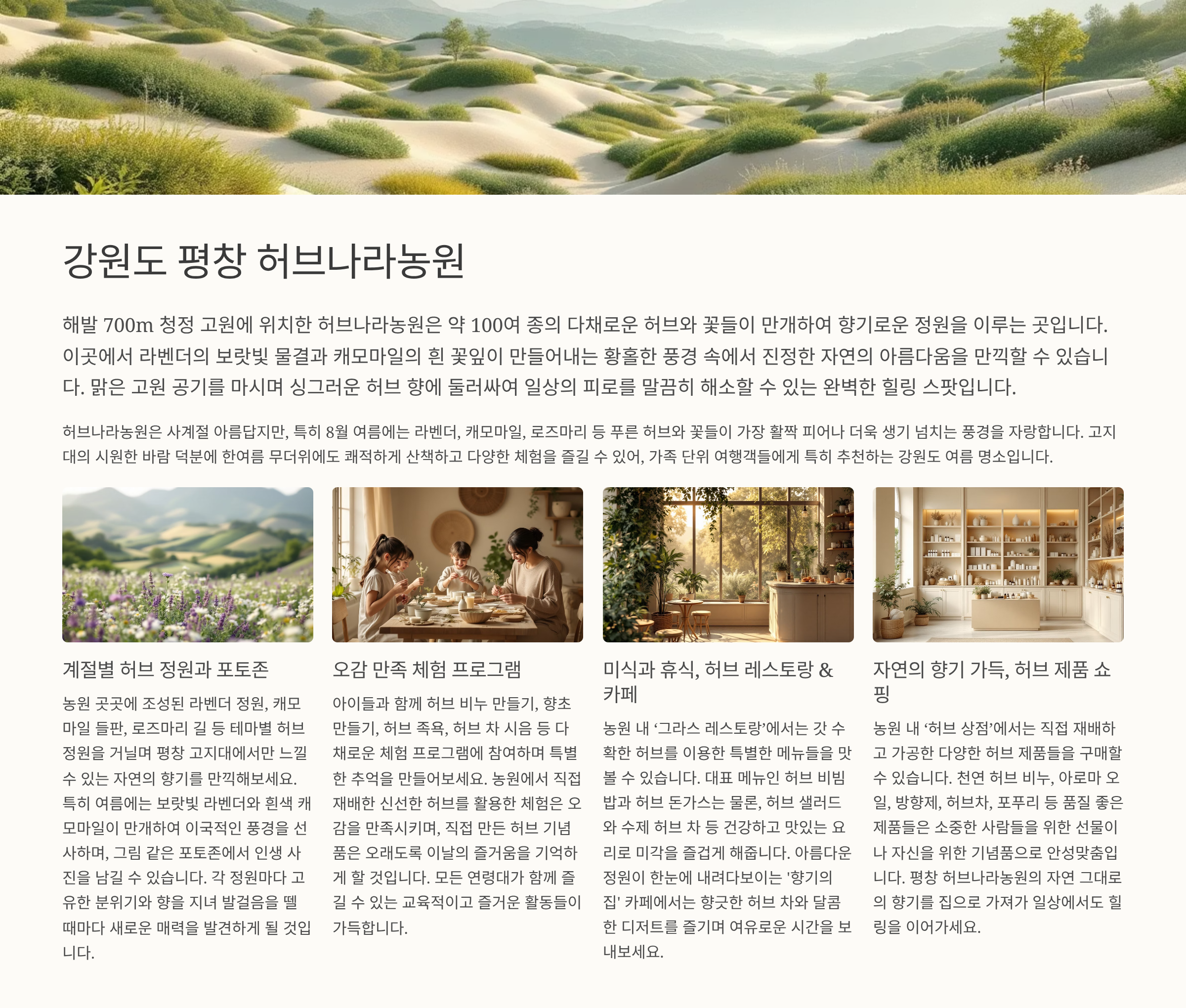 라벤더, 캐모마일 등 계절마다 다른 허브를 즐길 수 있으며, 아이들과 함께 참여할 수 있는 다양한 체험 프로그램도 준비되어 있어