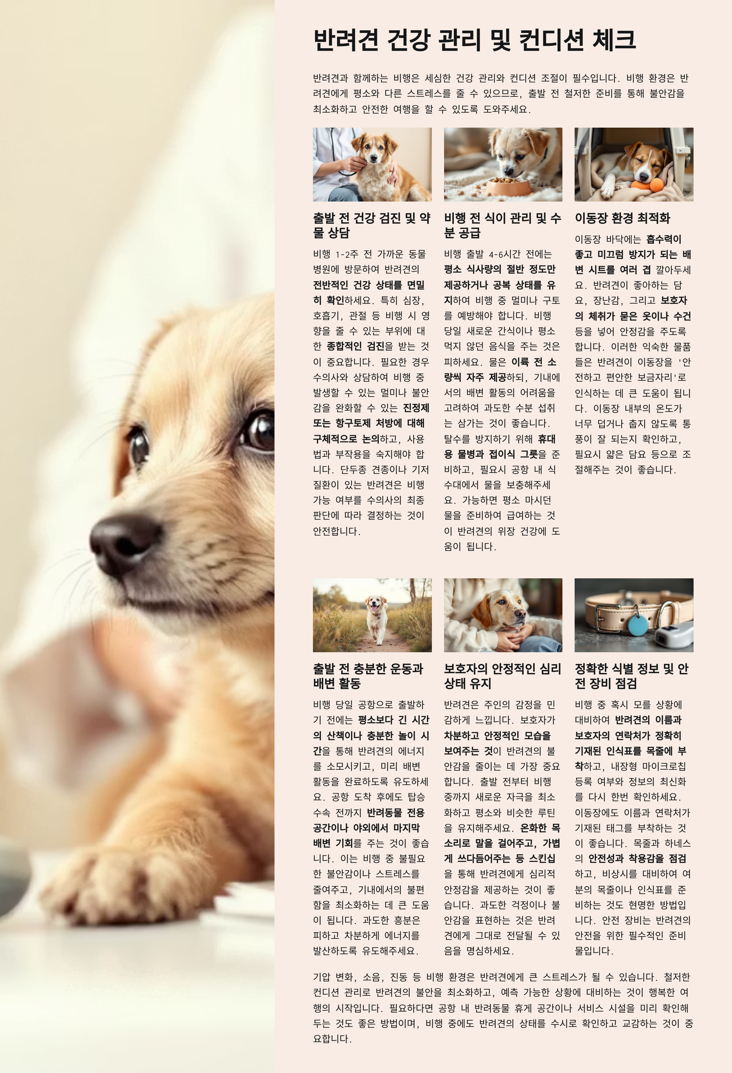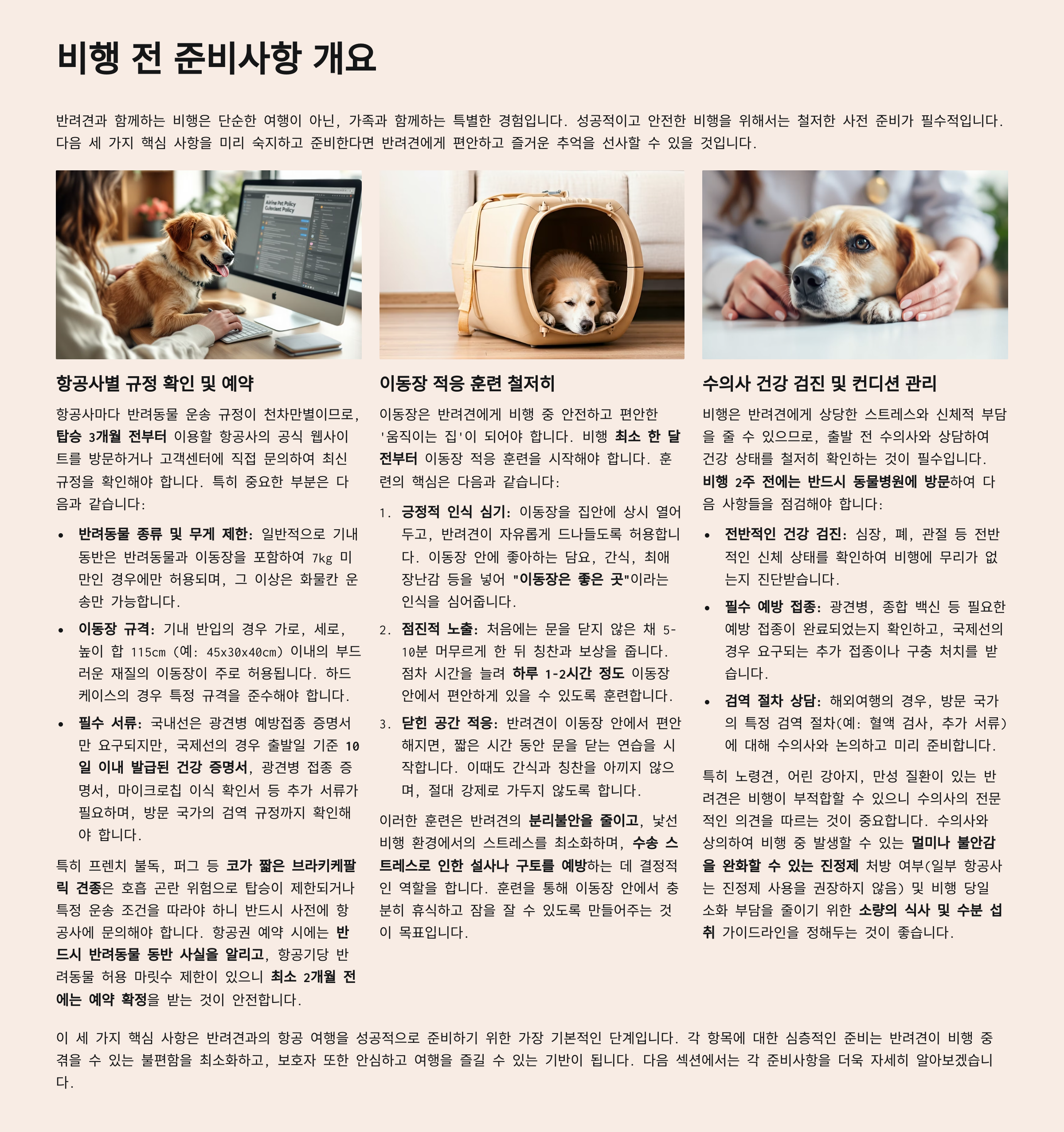 비행기 탑승은 강아지에게 낯선 환경과 장시간 이동이라는 스트레스를 동반하므로 철저한 사전 준비가 필요합니다.