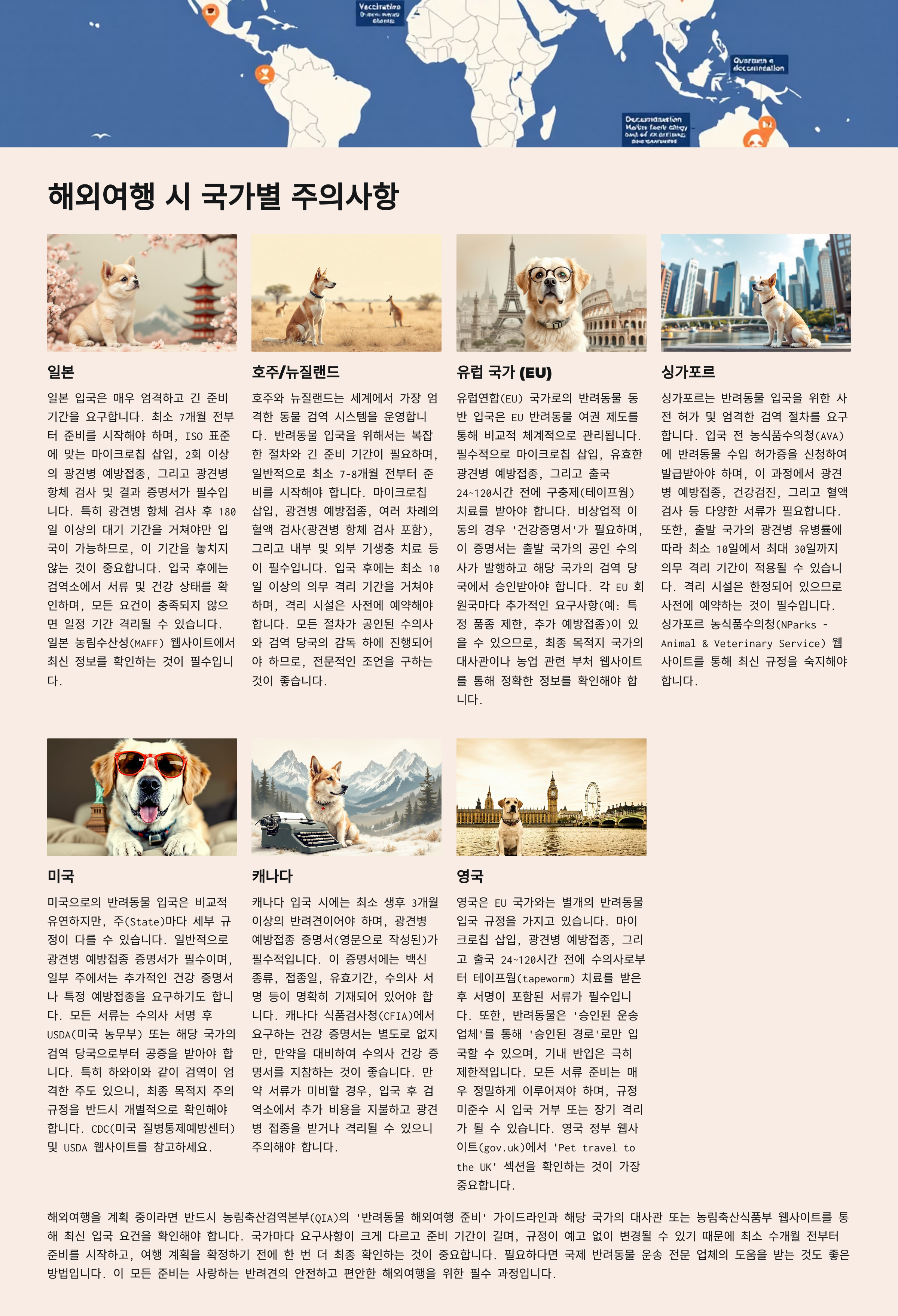 해외여행을 계획 중이라면 각 국가의 반려동물 입국 요건(검역, 예방접종, 마이크로칩 등)을 충분히 숙지해야 합니다.