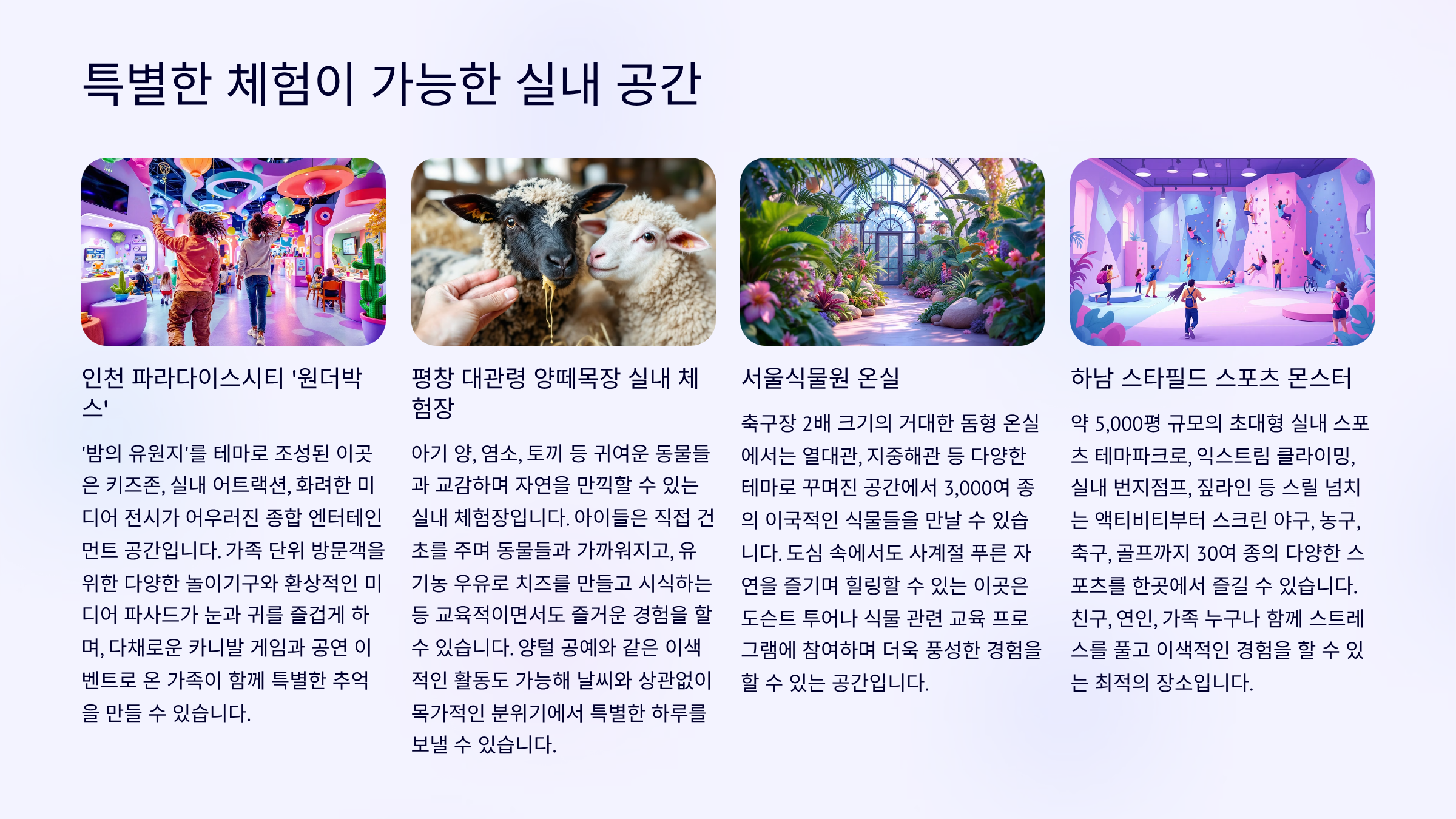 영상에 소개된 실내 여행지들을 간단히 정리하면 다음과 같습니다: