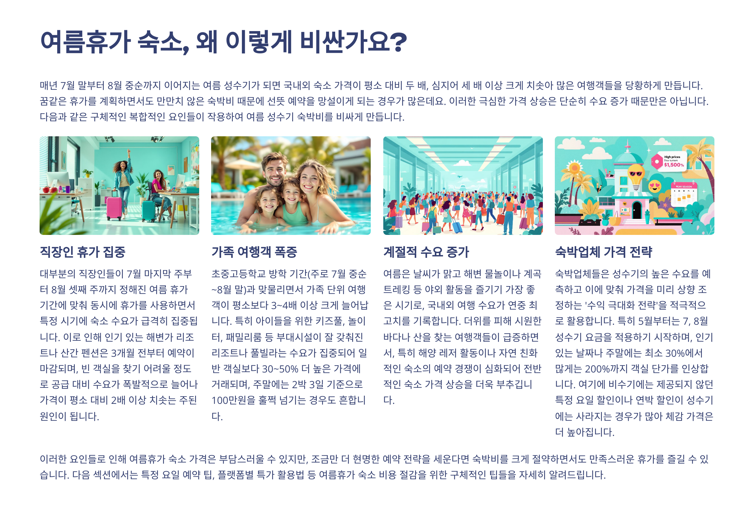 하지만 여름철에는 숙소 가격이 천정부지로 오르기 때문에, 합리적인 소비를 위해서는 전략적인 예약이 필수입니다.
