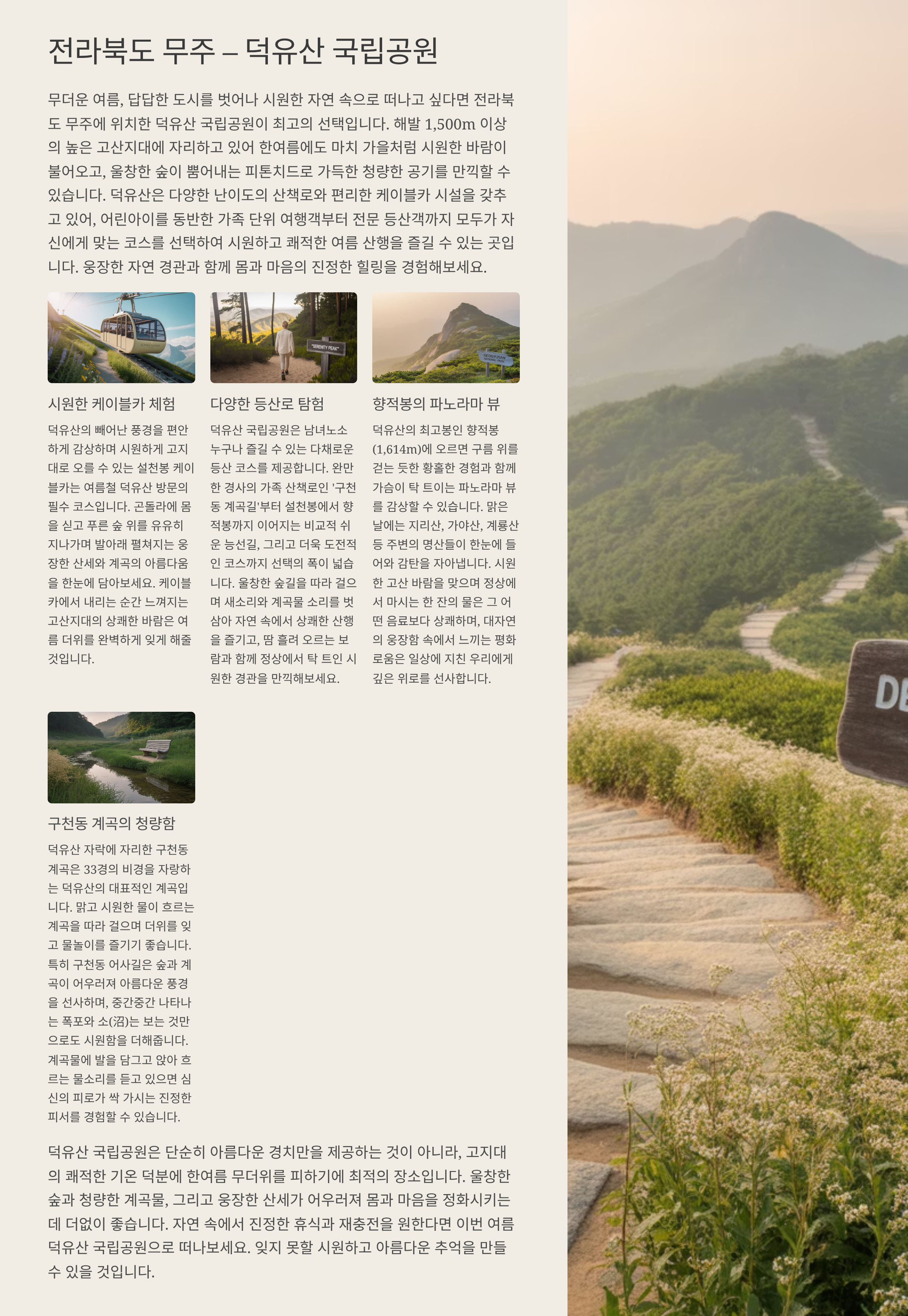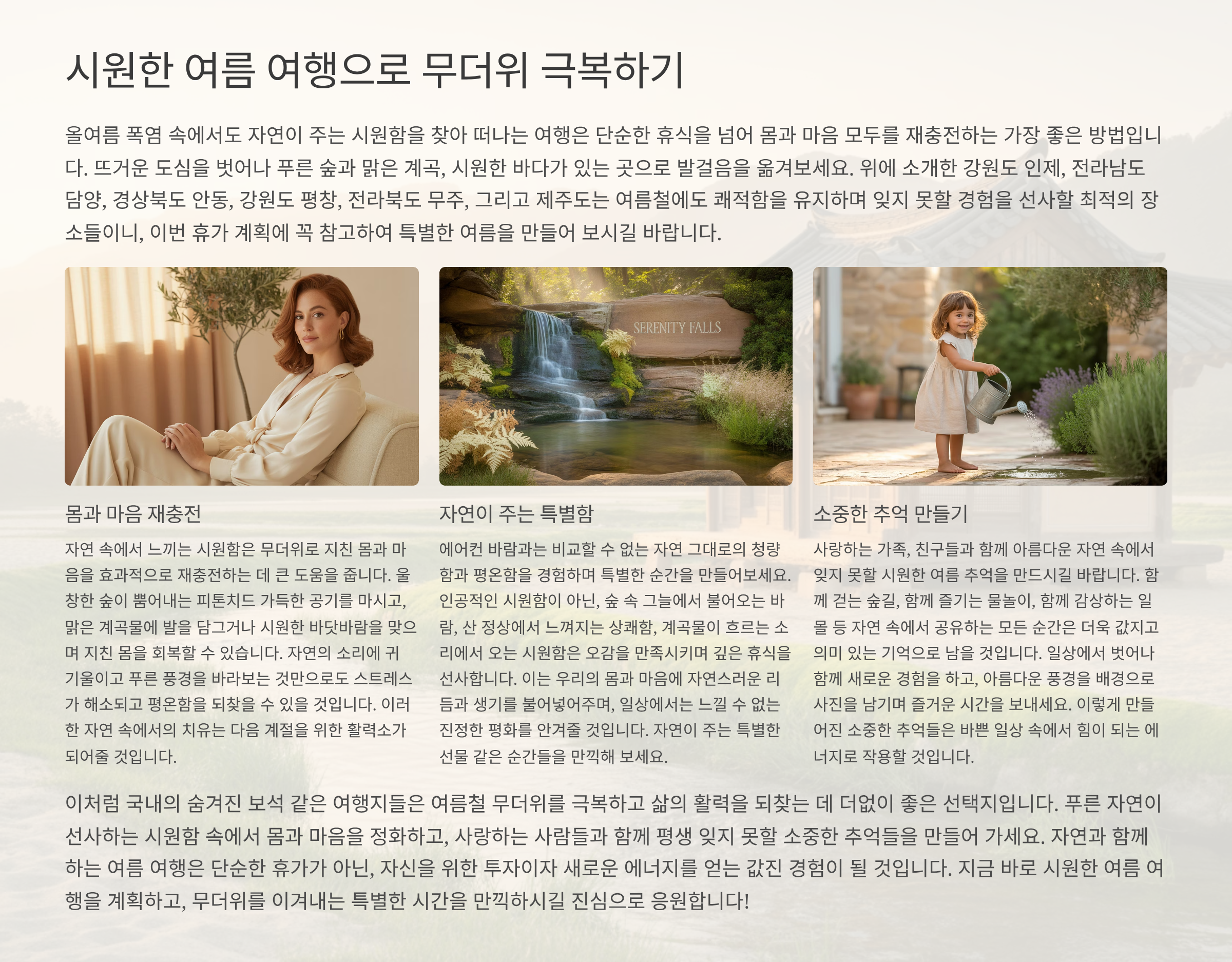 올여름 폭염 속에서도 자연이 주는 시원함을 찾아 떠나는 여행은 몸과 마음 모두를 재충전하는 좋은 방법입니다.
