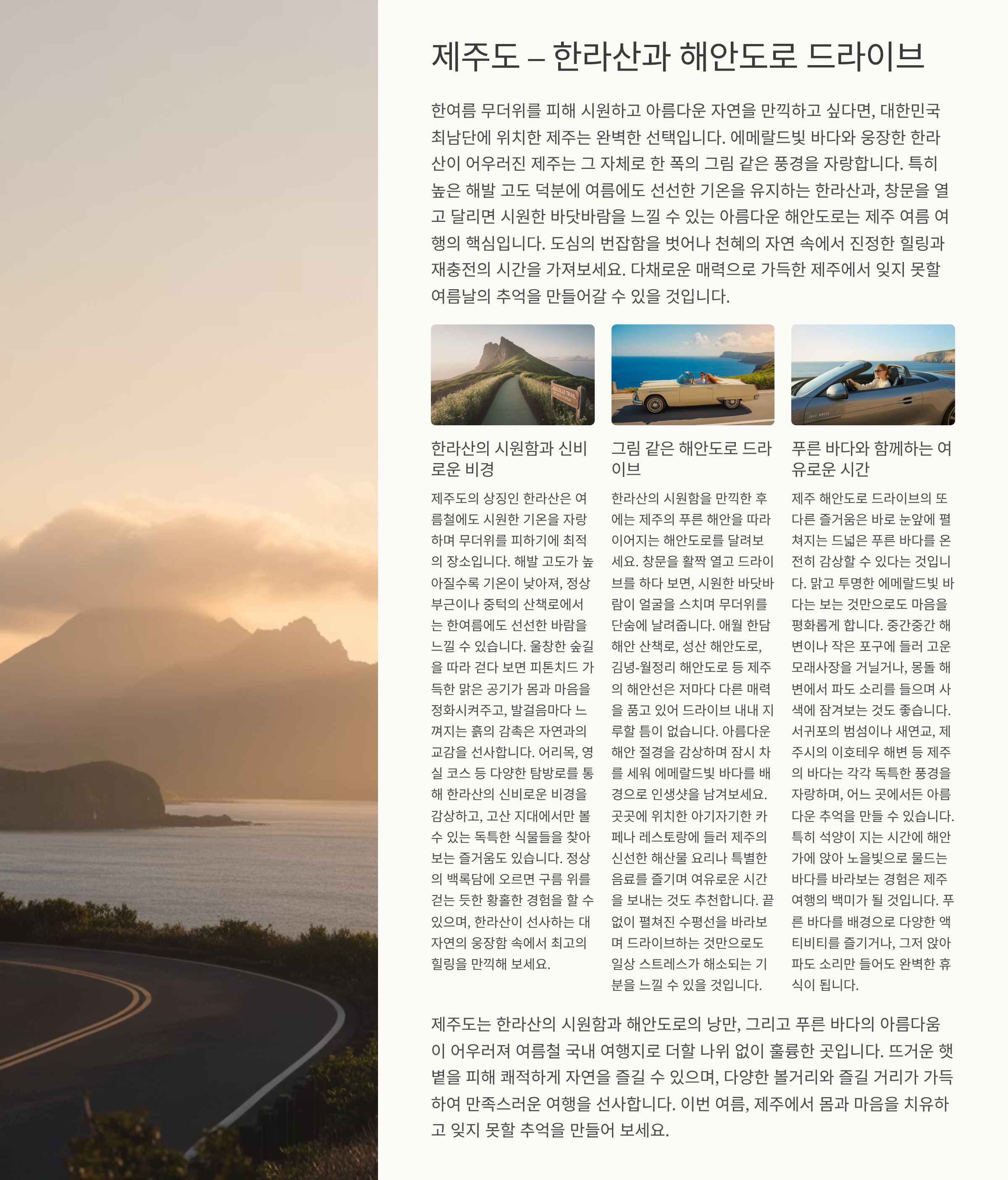 또한, 제주 해안도로를 따라 드라이브하며 시원한 바닷바람과 푸른 바다를 감상하는 것도 좋은 선택입니다.