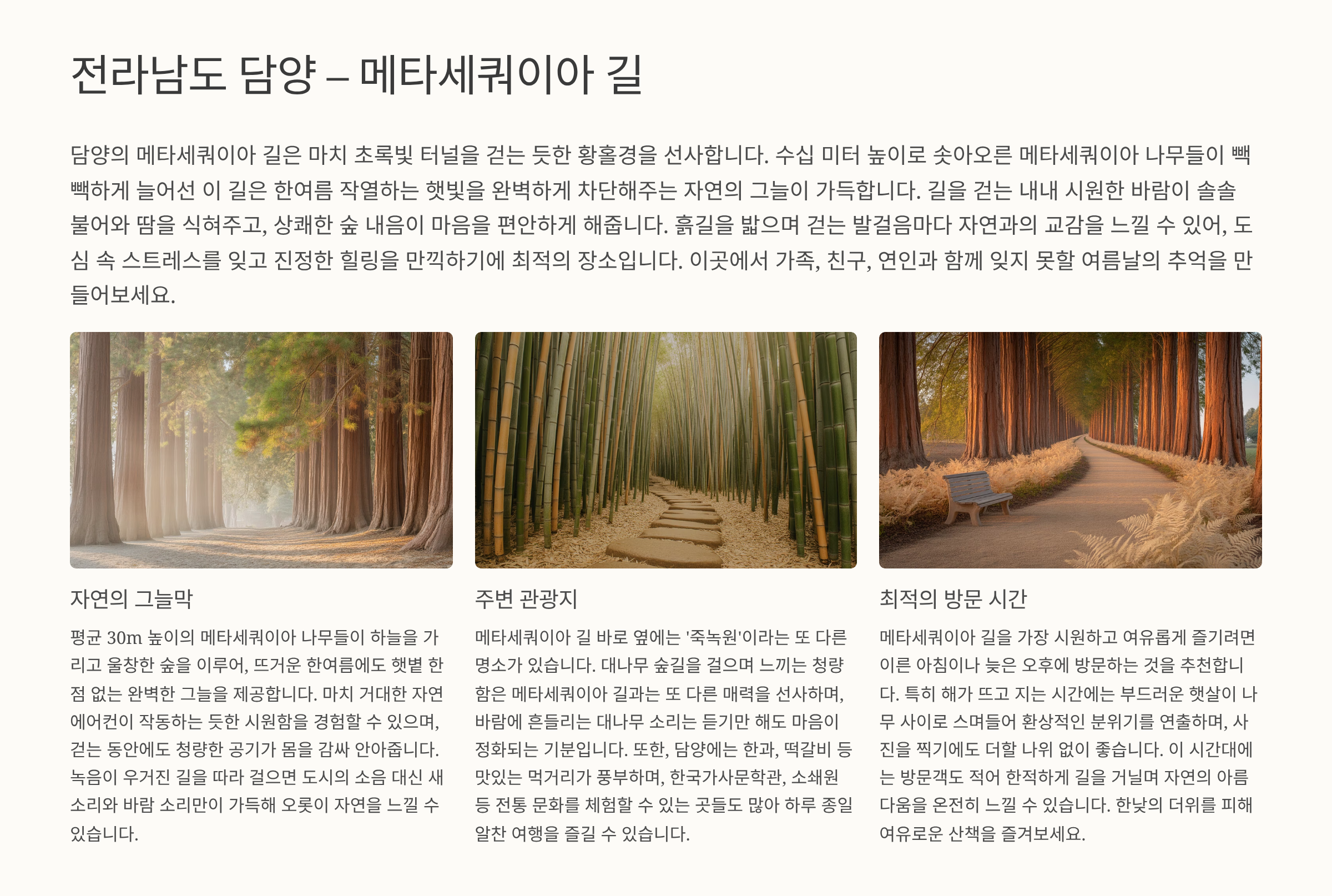 담양의 메타세쿼이아 길은 키 큰 나무들이 늘어선 길로, 여름 햇빛을 차단해 주는 자연의 그늘이 가득합니다.
