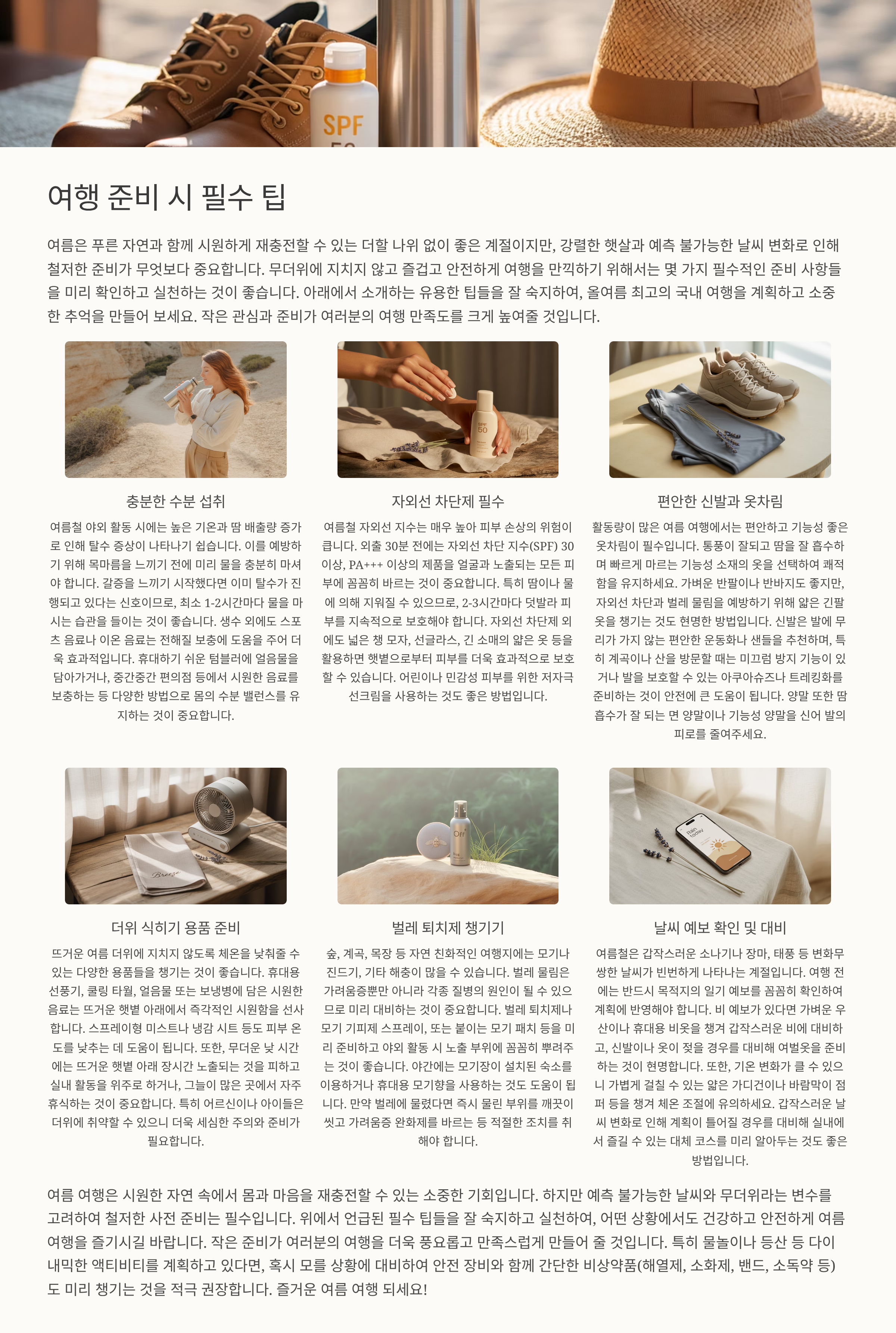 - 충분한 수분 섭취와 자외선 차단제는 필수입니다!