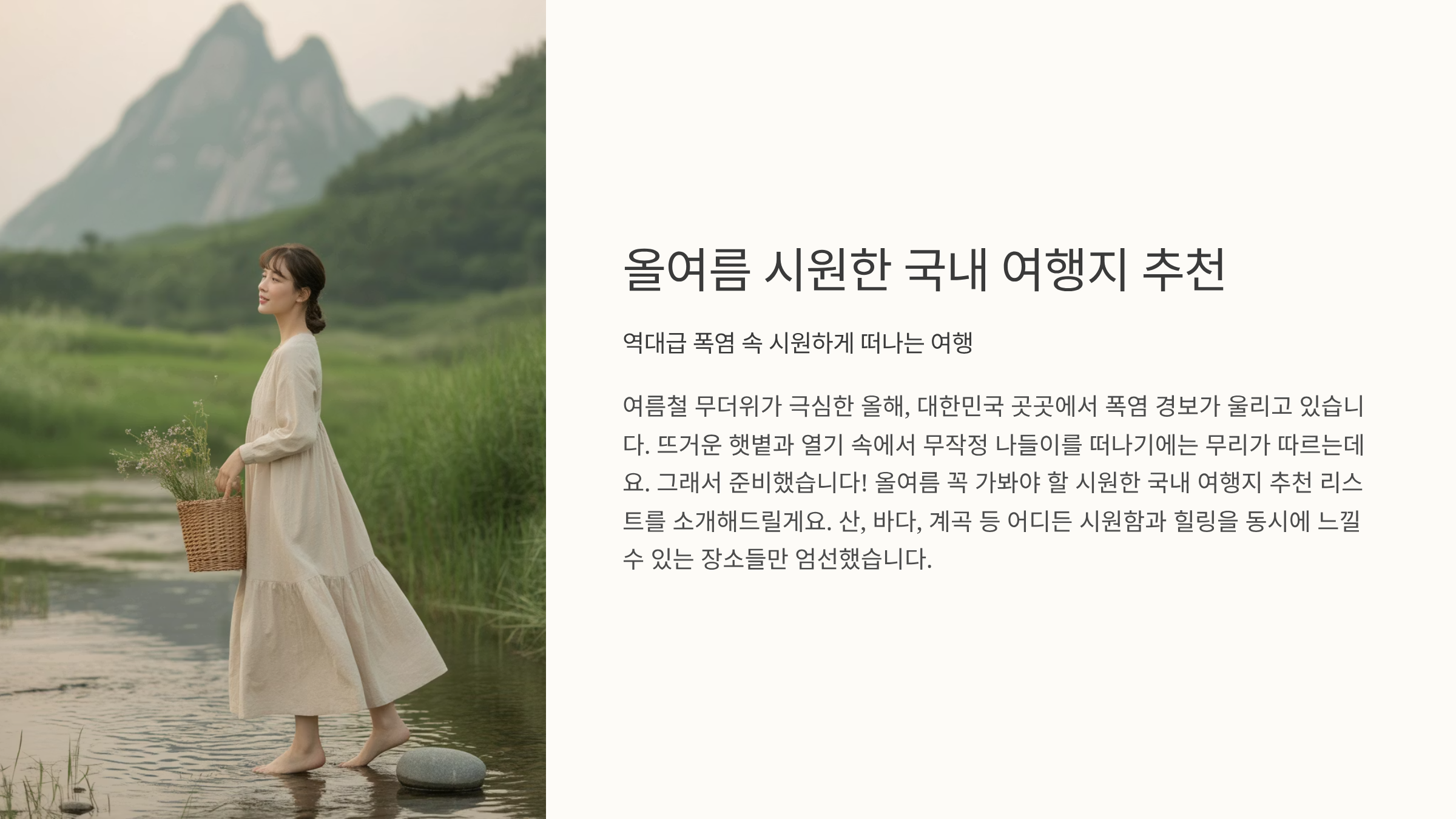 올여름 꼭 가봐야 할 시원한 국내 여행지 추천 리스트를 소개해드릴게요. 산, 바다, 계곡 등 어디든 시원함과 힐링을 동시에 느낄 수 있는 장소들만 엄선했습니다.