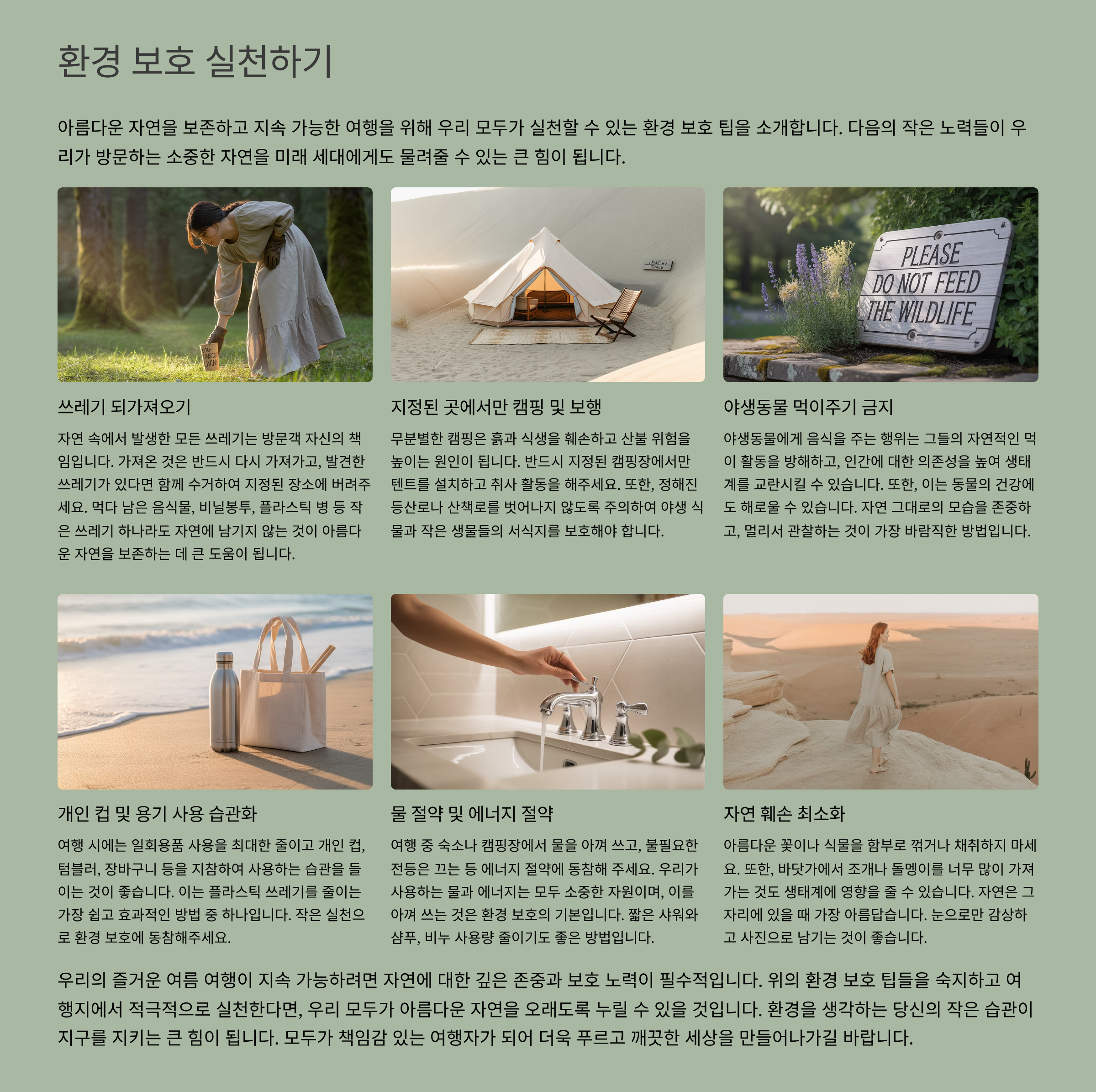 - 자연보호를 위해 쓰레기는 되가져오기, 지정된 곳에서만 캠핑하기 등 환경 보호에 신경 써주세요.