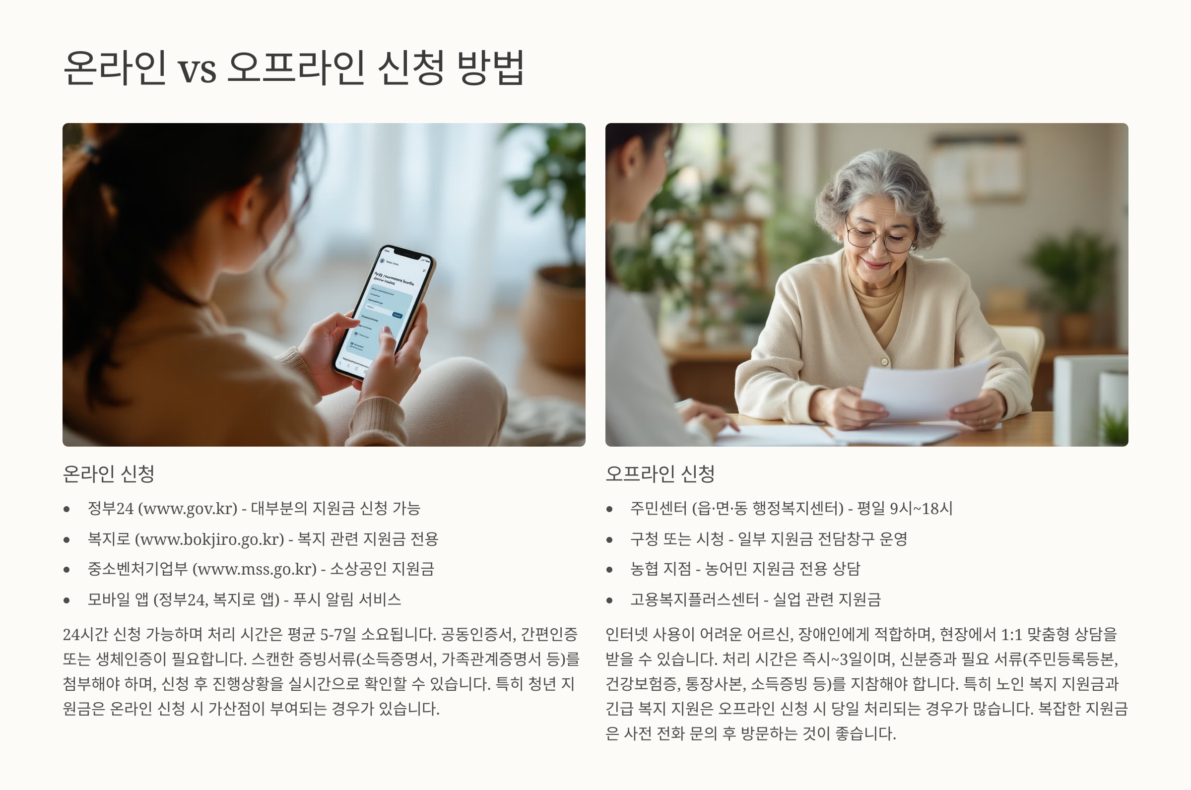 - 오프라인 신청: 주민센터, 구청, 해당 기관 방문 신청 가능