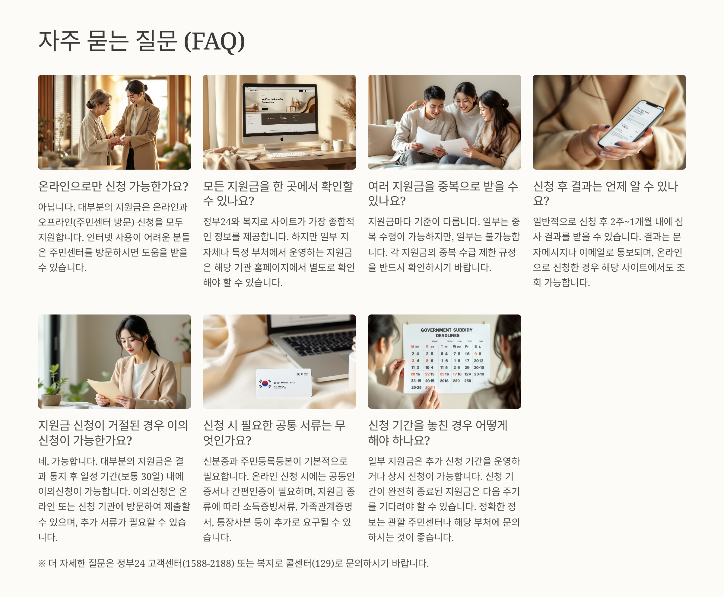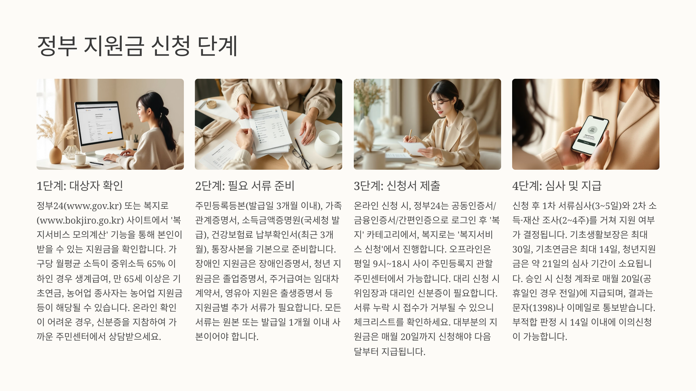 - 온라인 신청: 정부 24, 복지로, 각 부처 전용 사이트 이용