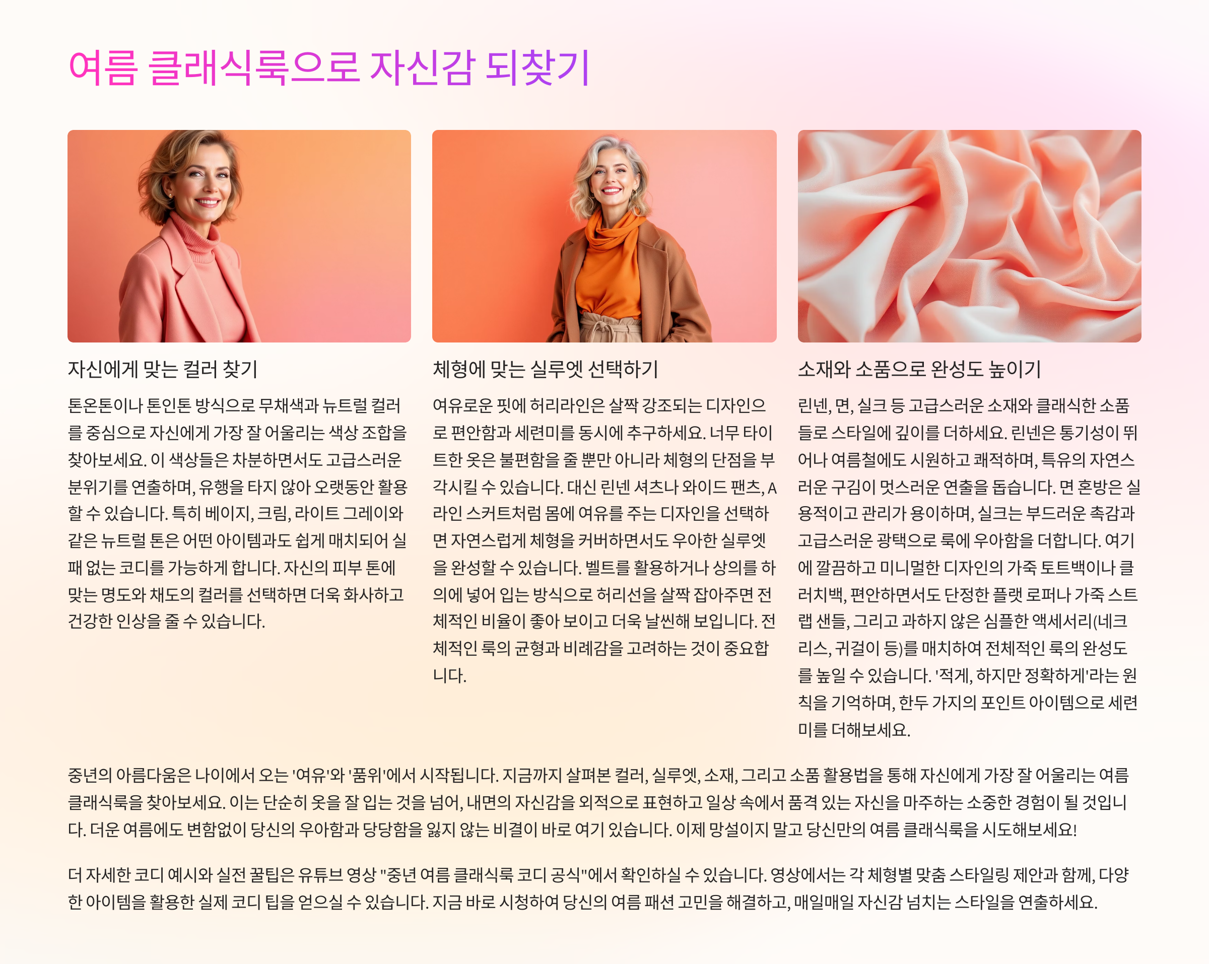이번 글에서는 유튜브 영상 “중년 여름 클래식룩 코디 공식”에서 소개한 코디 노하우를 바탕으로, 컬러 선택법, 핏 조절 팁,