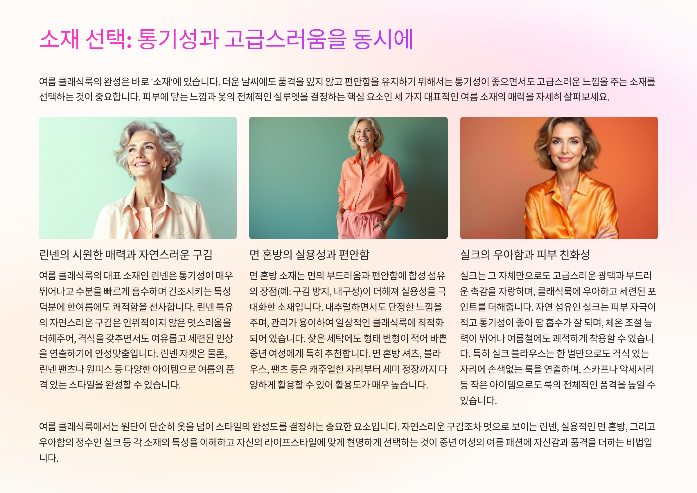 중년 여성에게 있어 여름 코디는 단순한 옷 입기를 넘어 ‘자신감’을 입는 과정입니다.