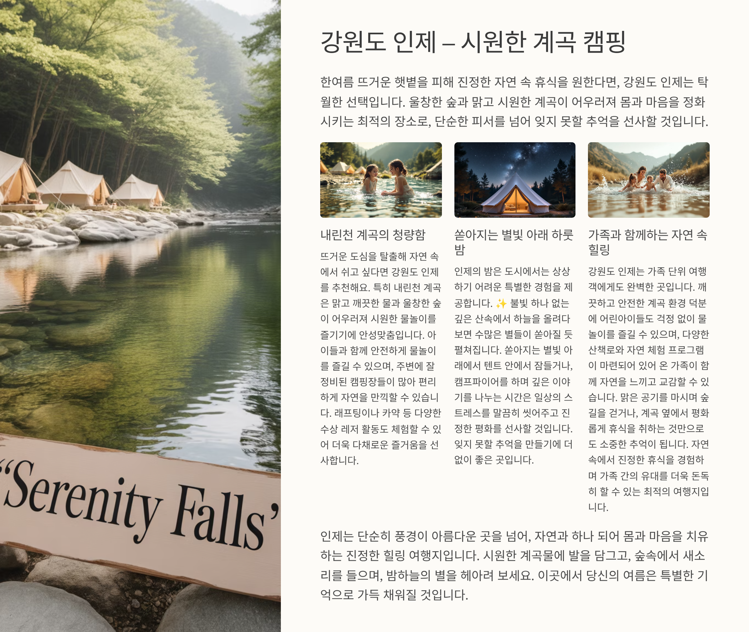 내린천 계곡은 아이들과 함께 물놀이하기에도 좋고, 캠핑장도 잘 갖춰져 있어요. 하늘 아래 펼쳐진 별빛은 보너스 ✨