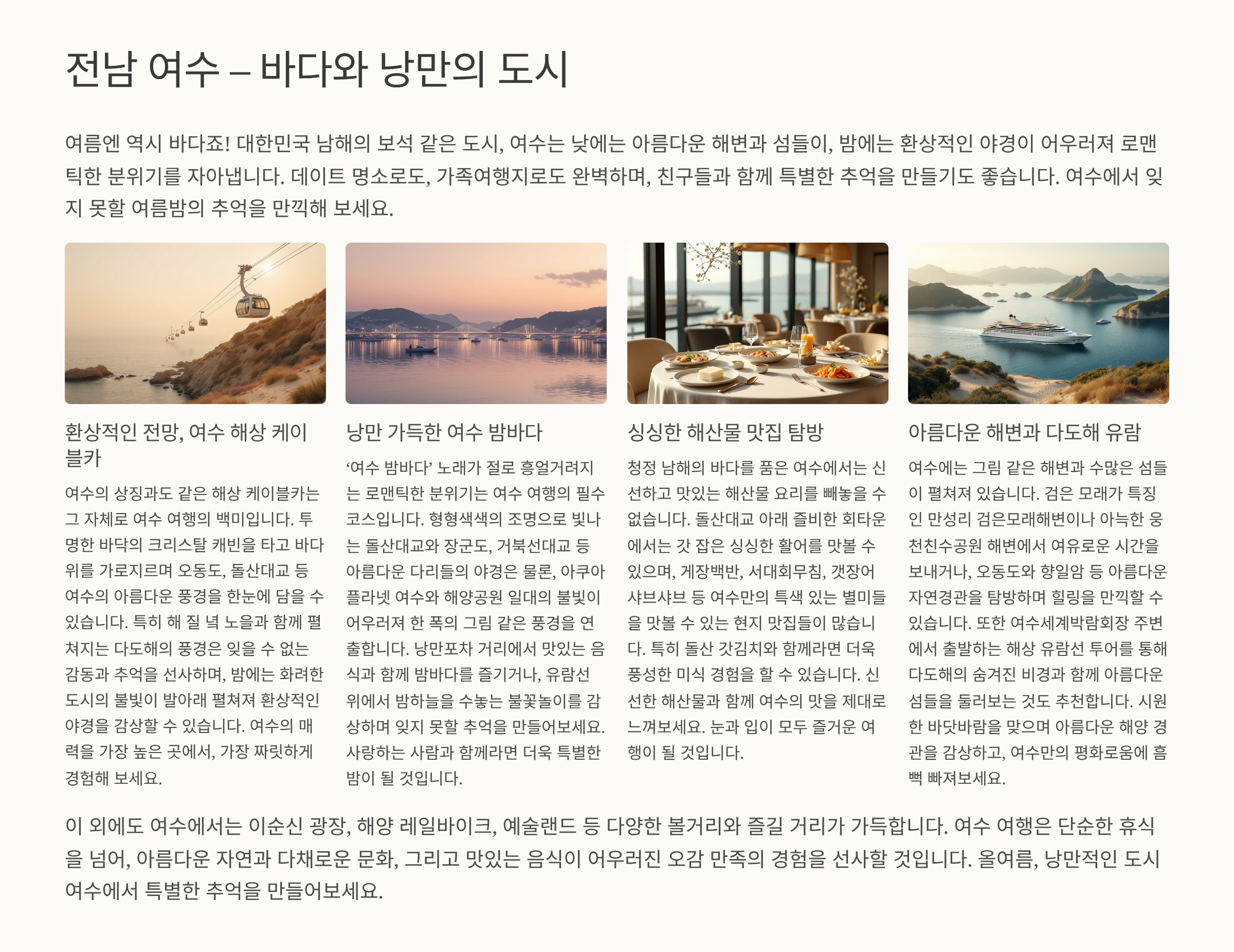해상 케이블카, 여수 밤바다 야경, 돌산대교 아래 회타운까지. 데이트 명소로도, 가족여행지로도 완벽해요.