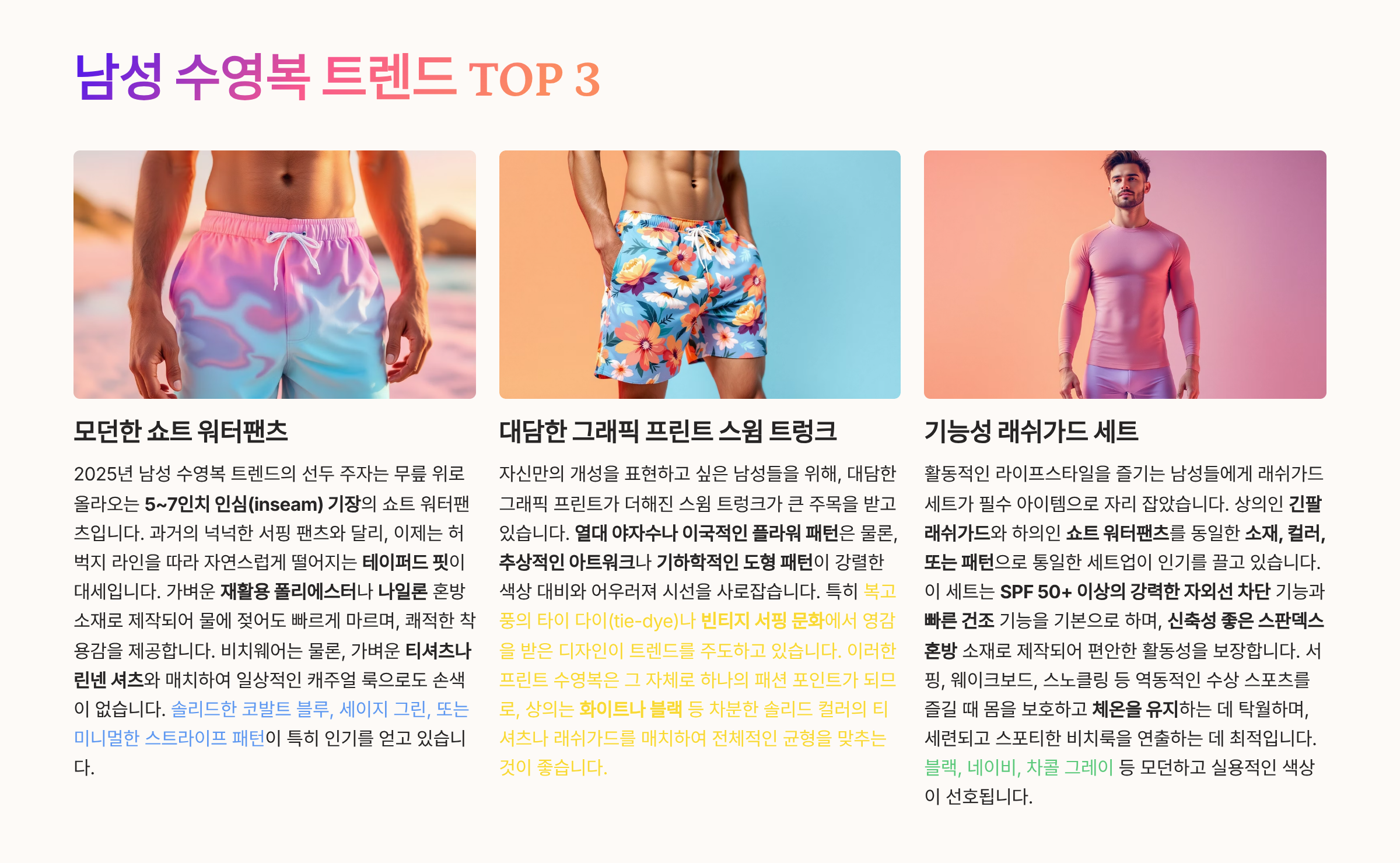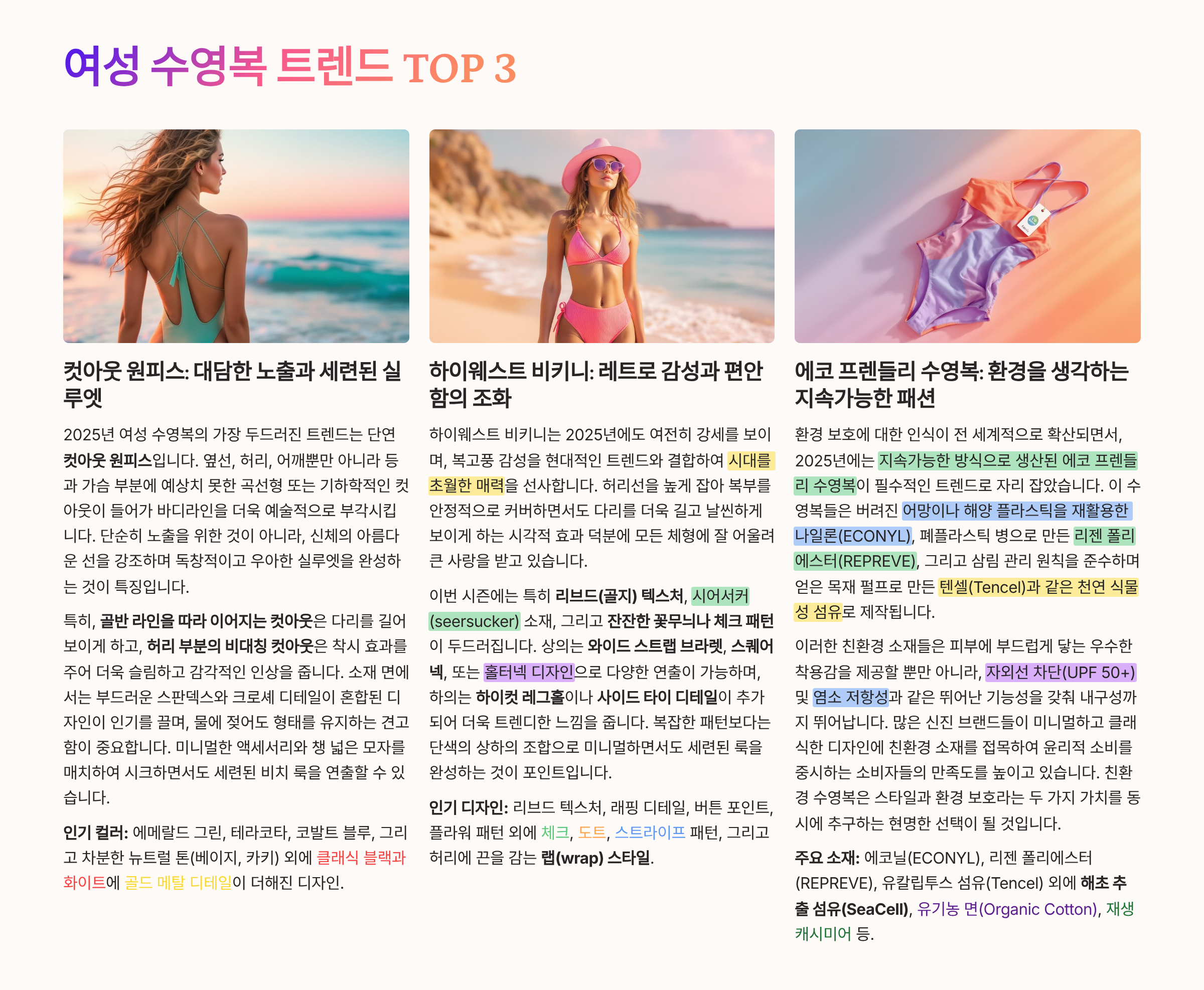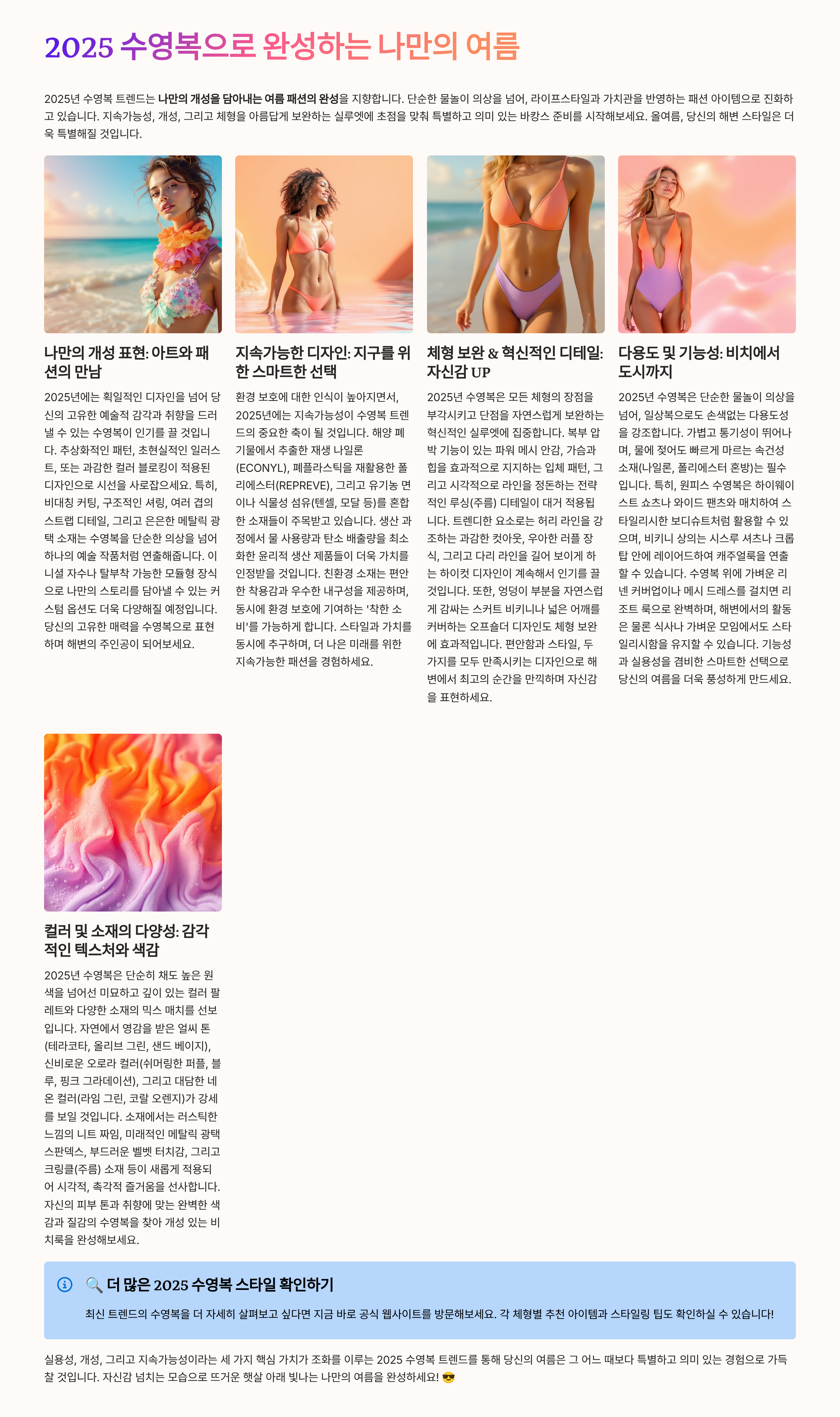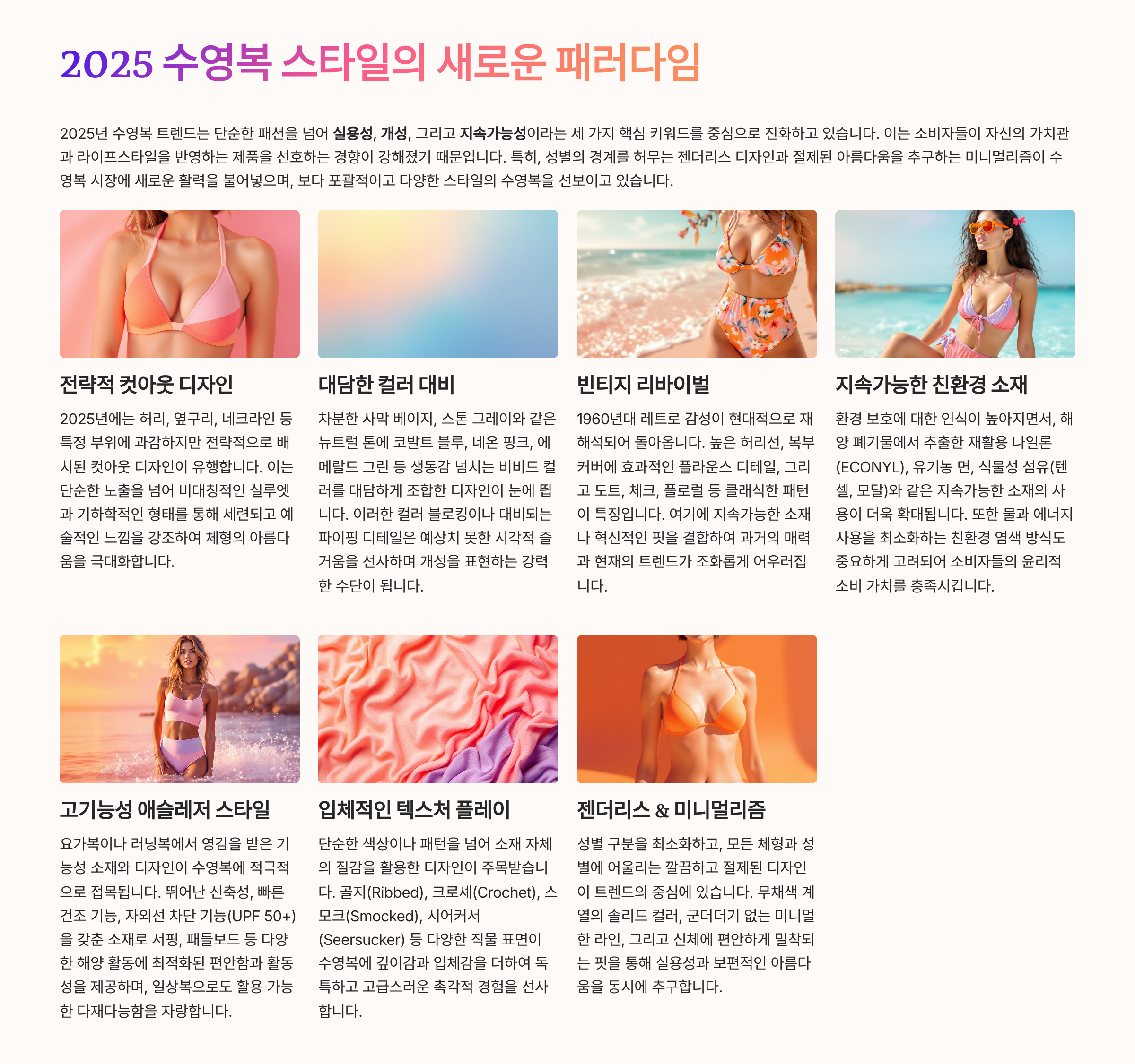 2025년 수영복 스타일은 ‘실용+개성+지속가능성’이 핵심입니다.