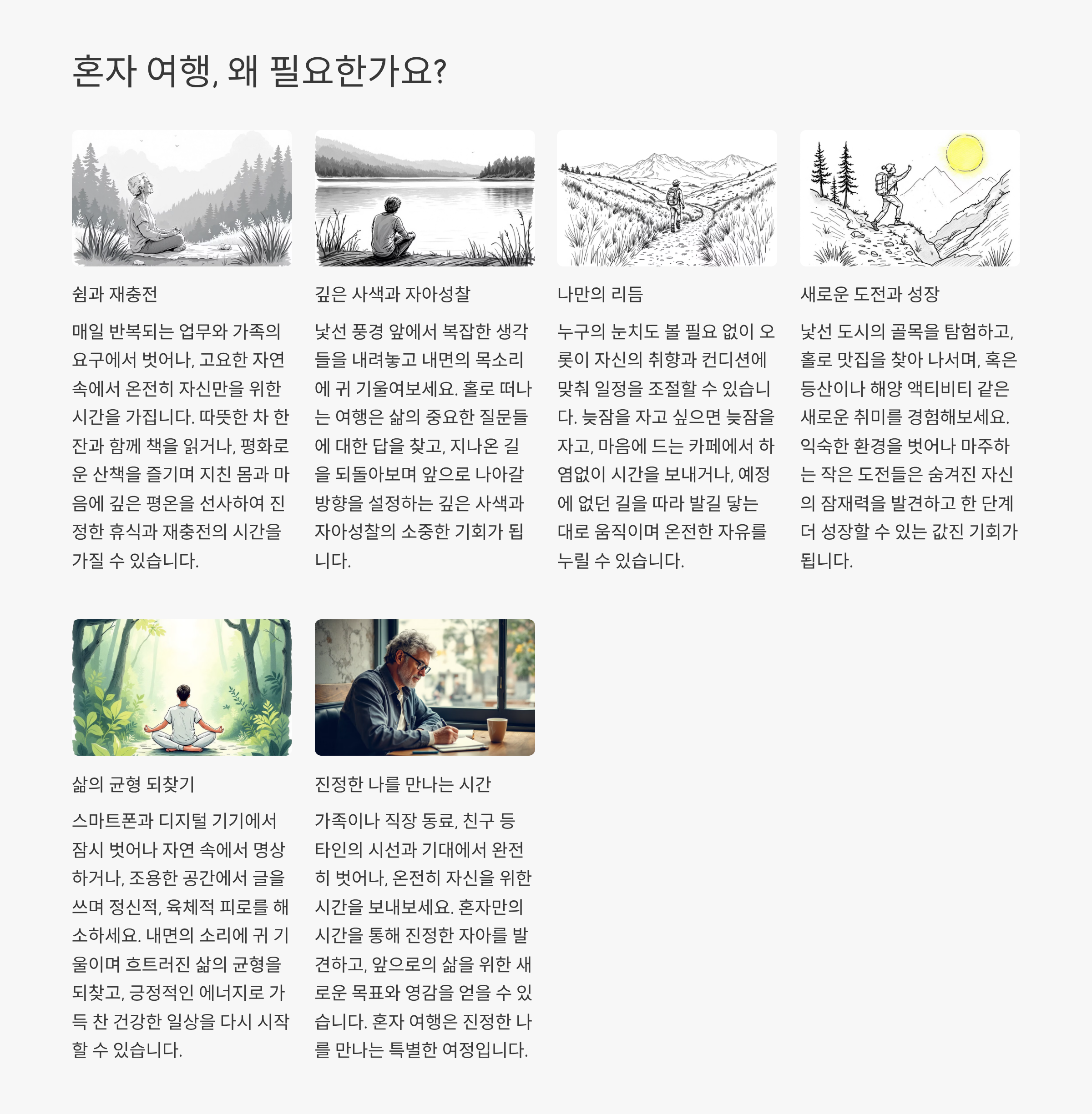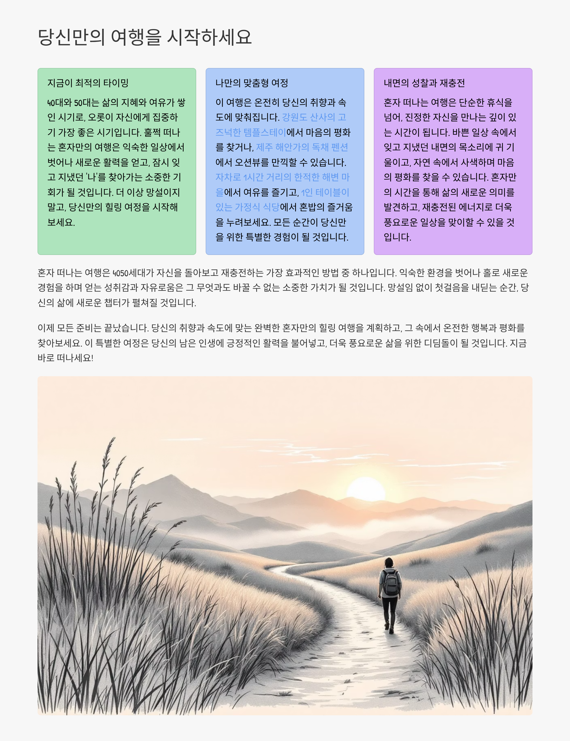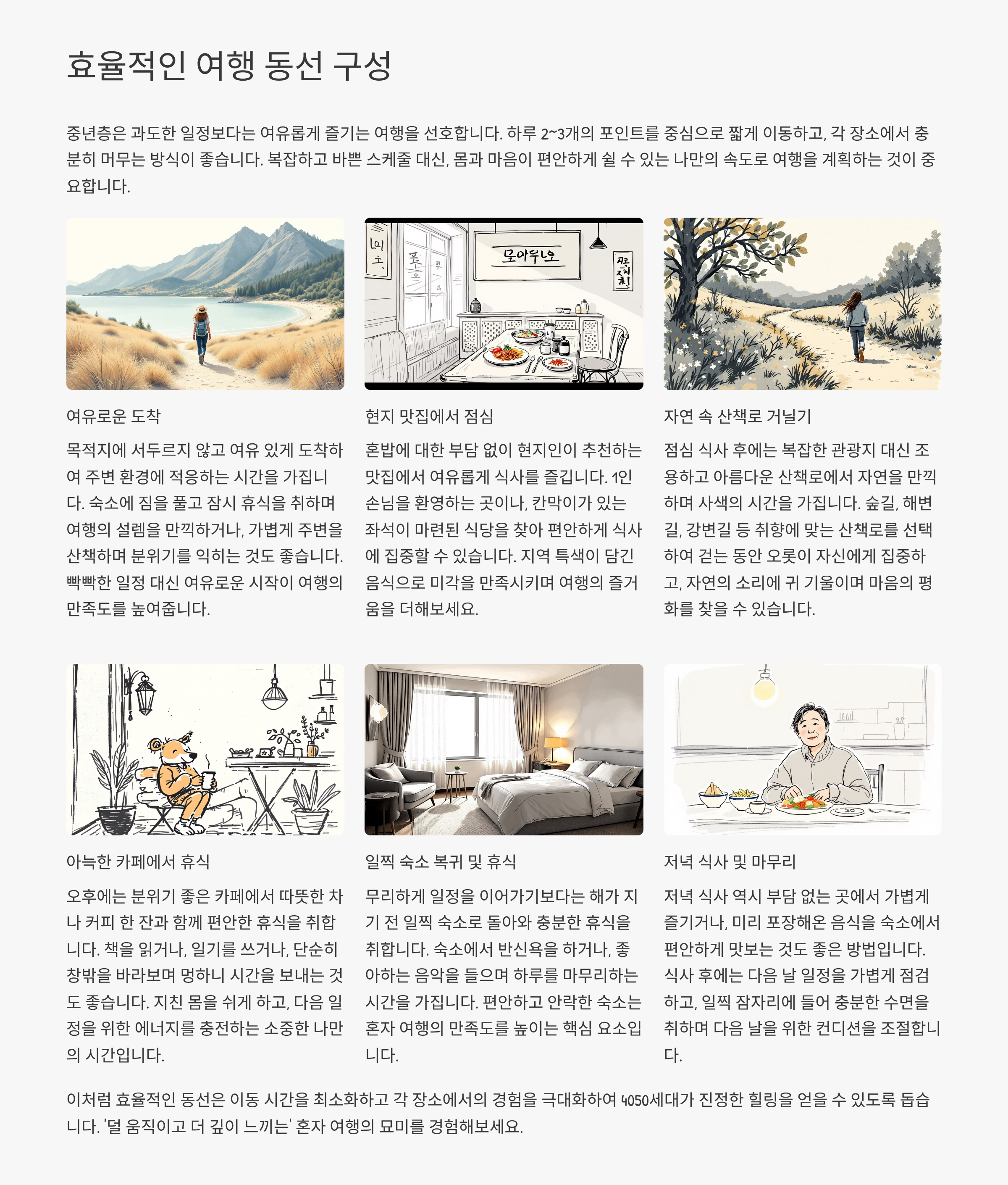 혼자 여행을 준비하는 중년층에게는 단순한 장소 추천뿐 아니라 실제 실행 가능한 콘텐츠 구성이 중요합니다.