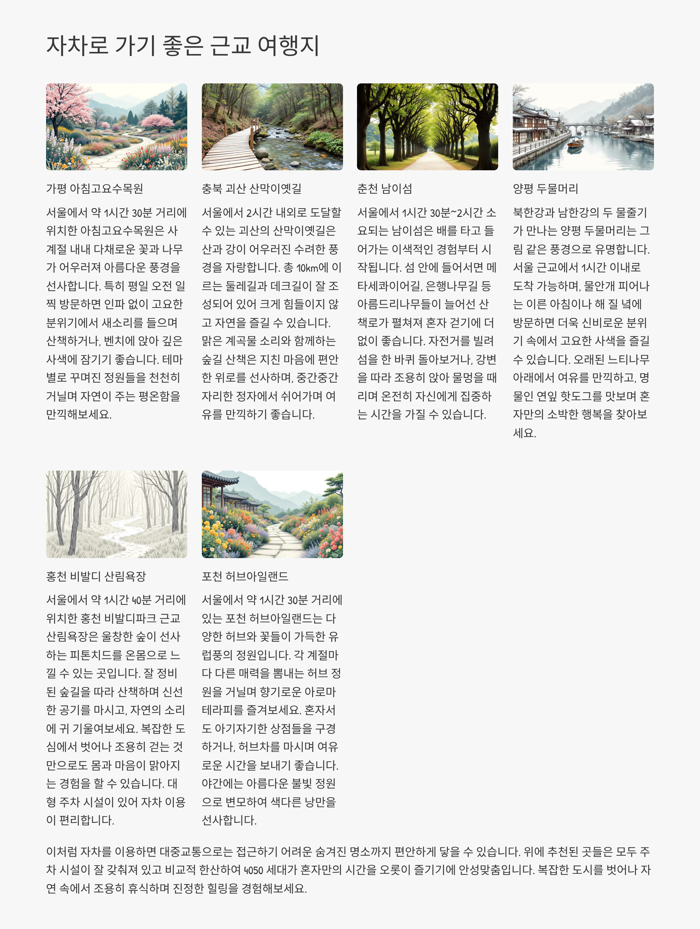 서울 및 수도권 거주자를 기준으로 추천할 만한 자차 여행지는 다음과 같습니다: