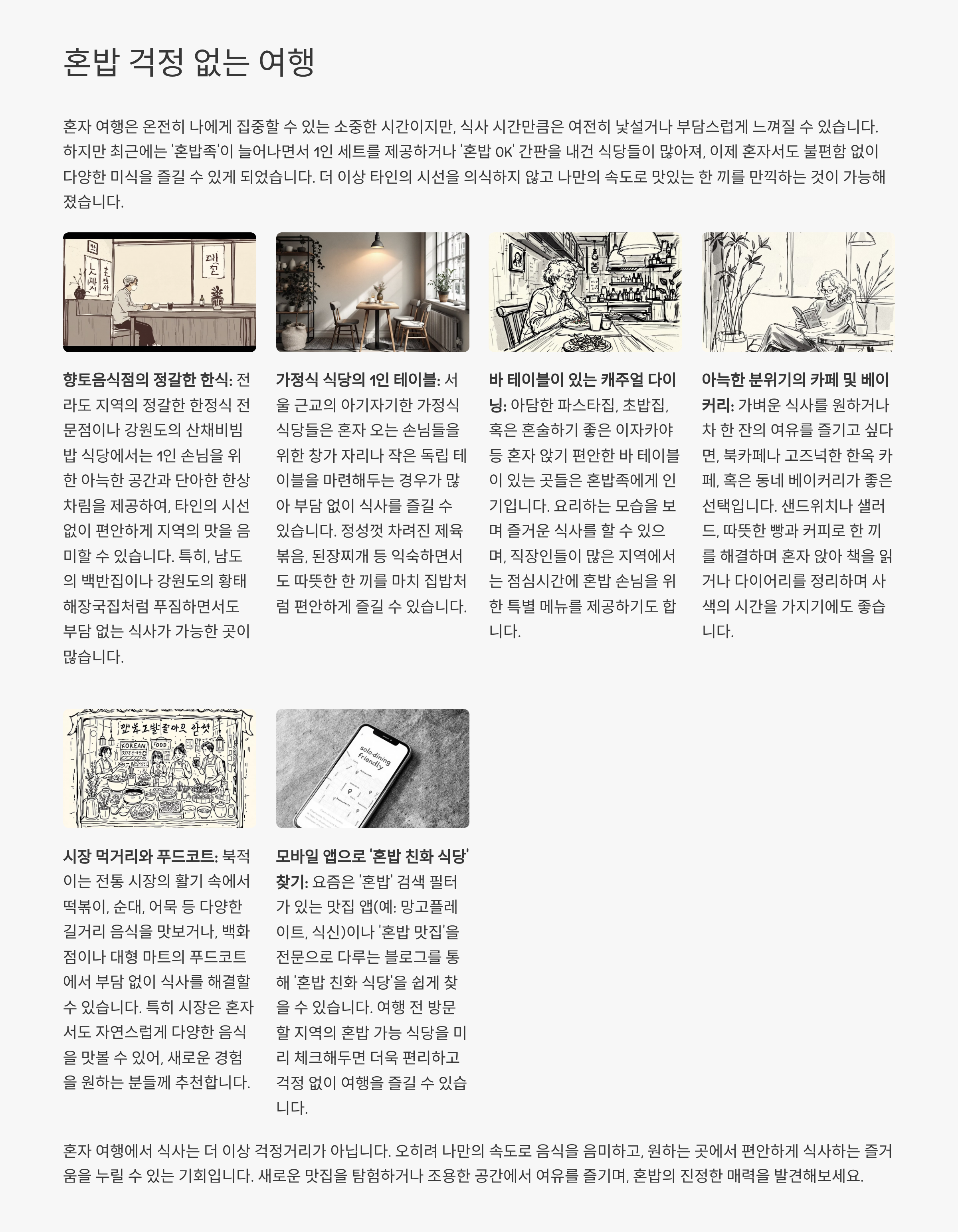 특히 ‘혼밥 가능한 식당’, ‘조용한 숙소’, ‘여행 동선’까지 모두 고려해야 진짜 도움이 되는 정보가 되죠. 먼저, 혼밥 문제는 예