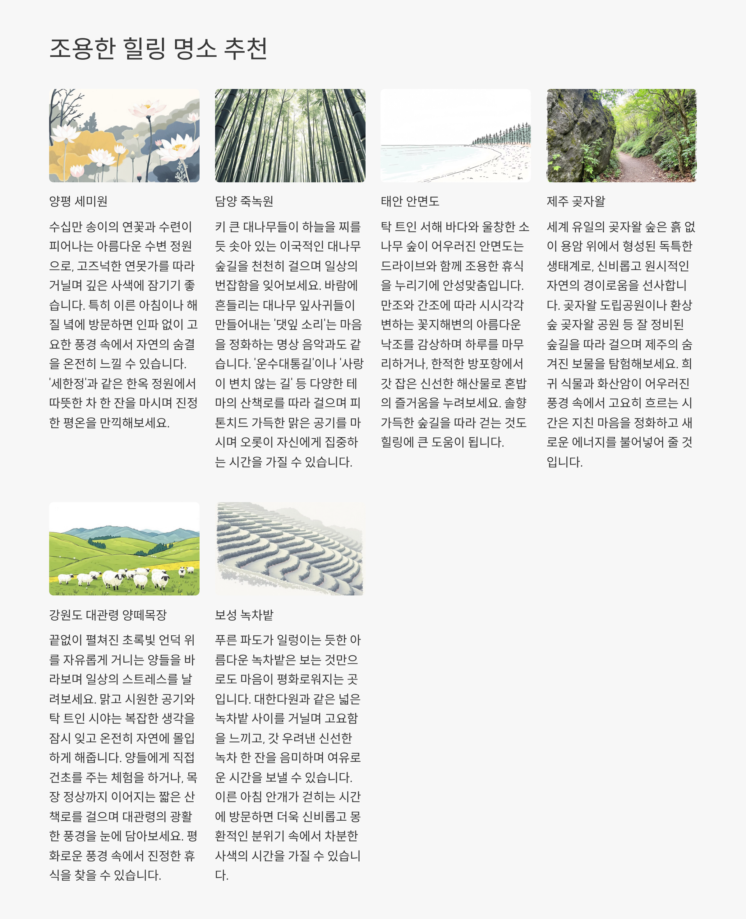 이들 장소는 자연을 배경으로 혼자 조용히 걸으며 자신만의 리듬을 찾을 수 있는 환경을 제공합니다.