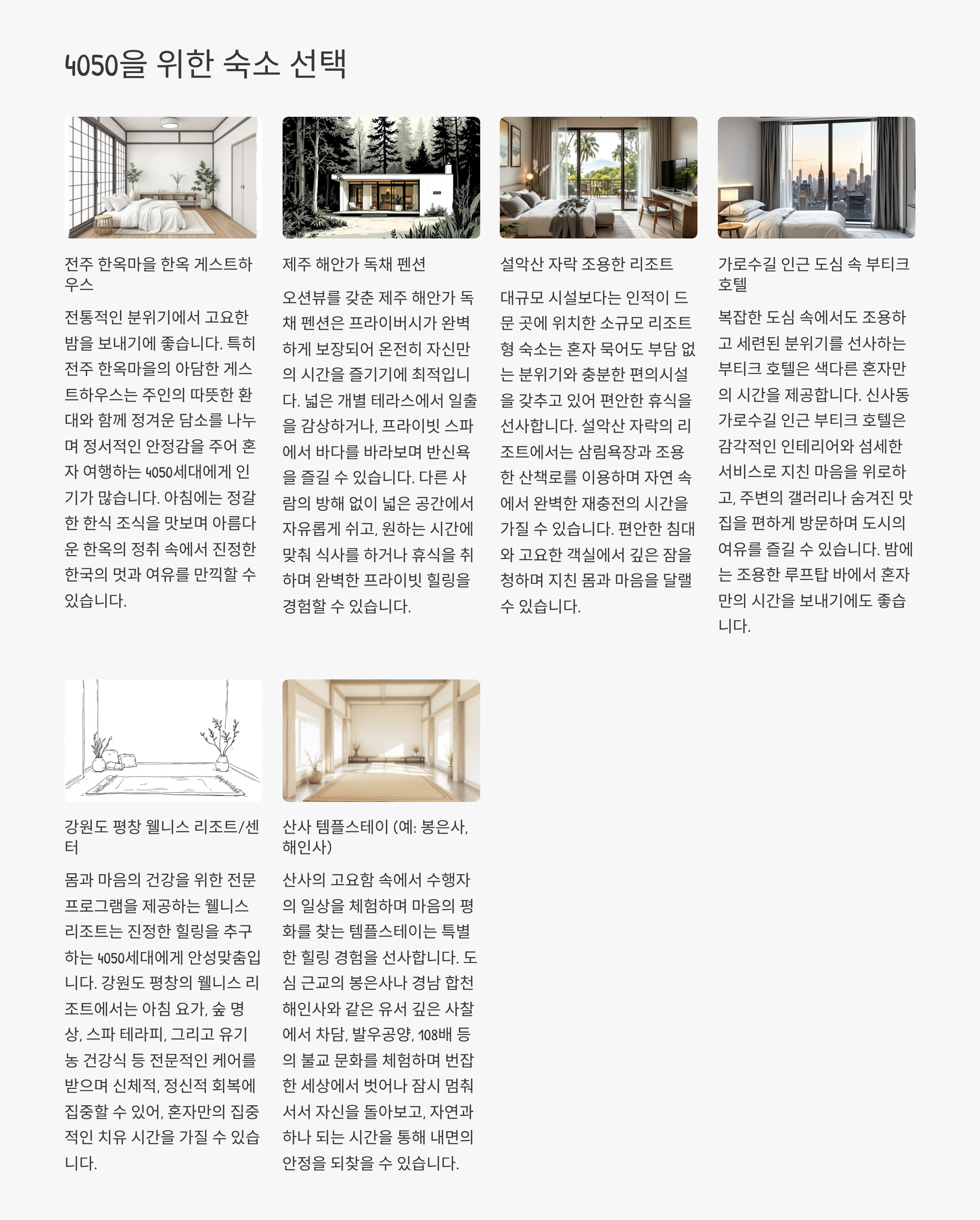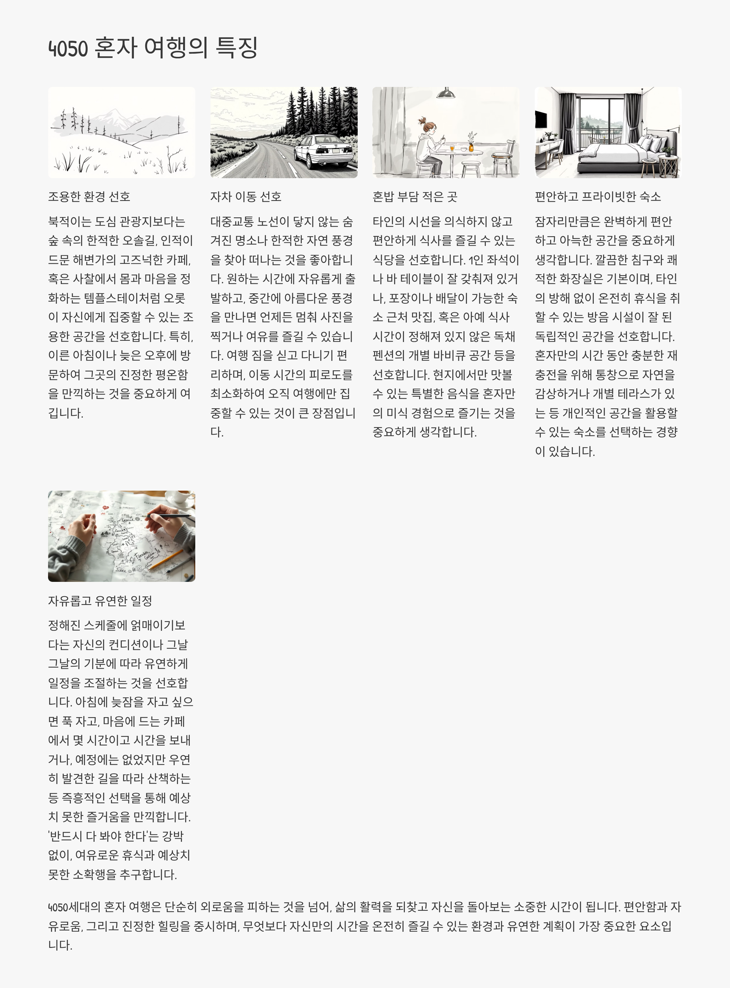 중년을 위한 맞춤형 혼자 여행 콘텐츠 (여행 계획, 혼밥, 숙소)