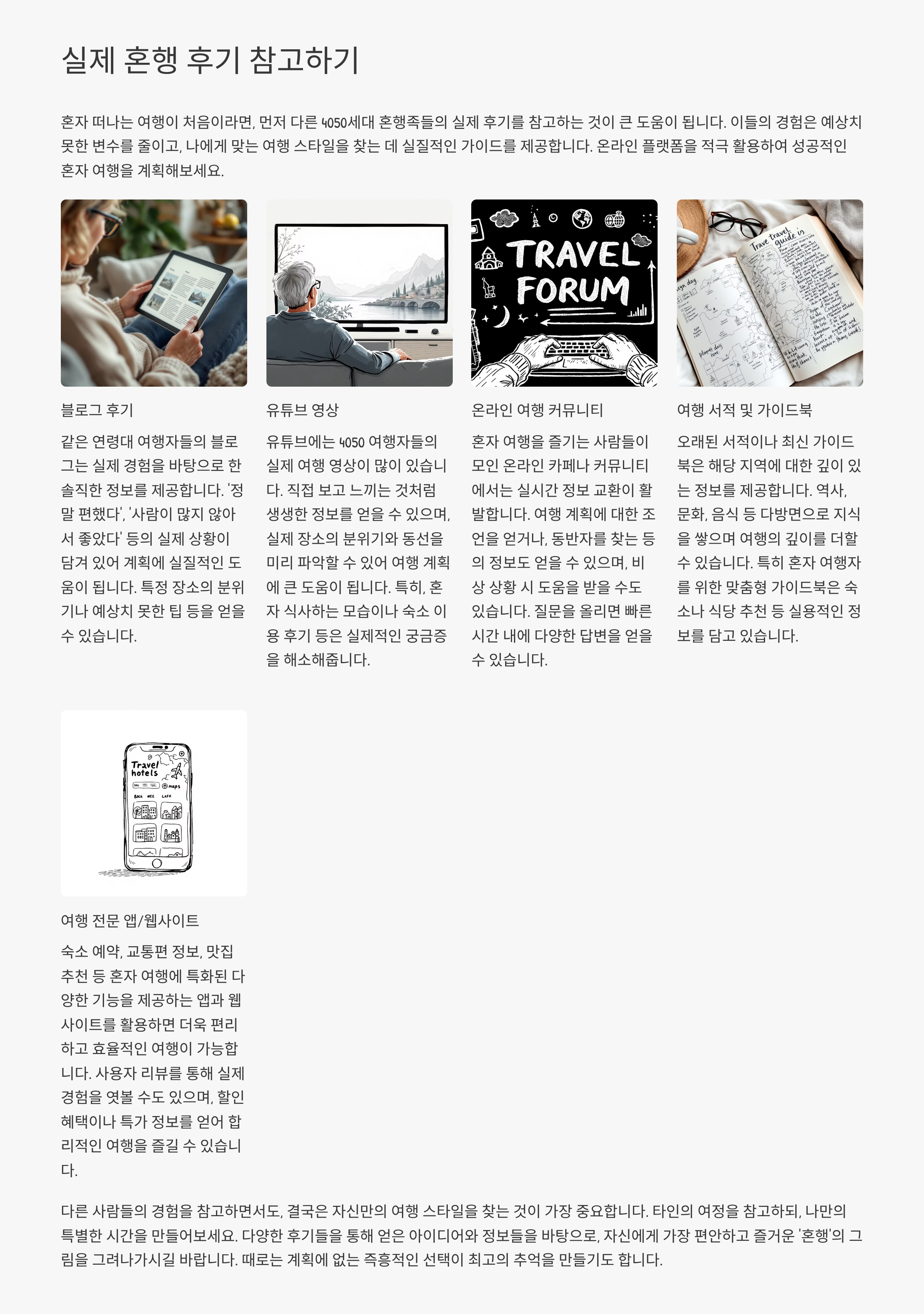 마지막으로, 블로그나 유튜브 등에서 다른 4050 여행자의 후기를 참고하는 것도 좋습니다.