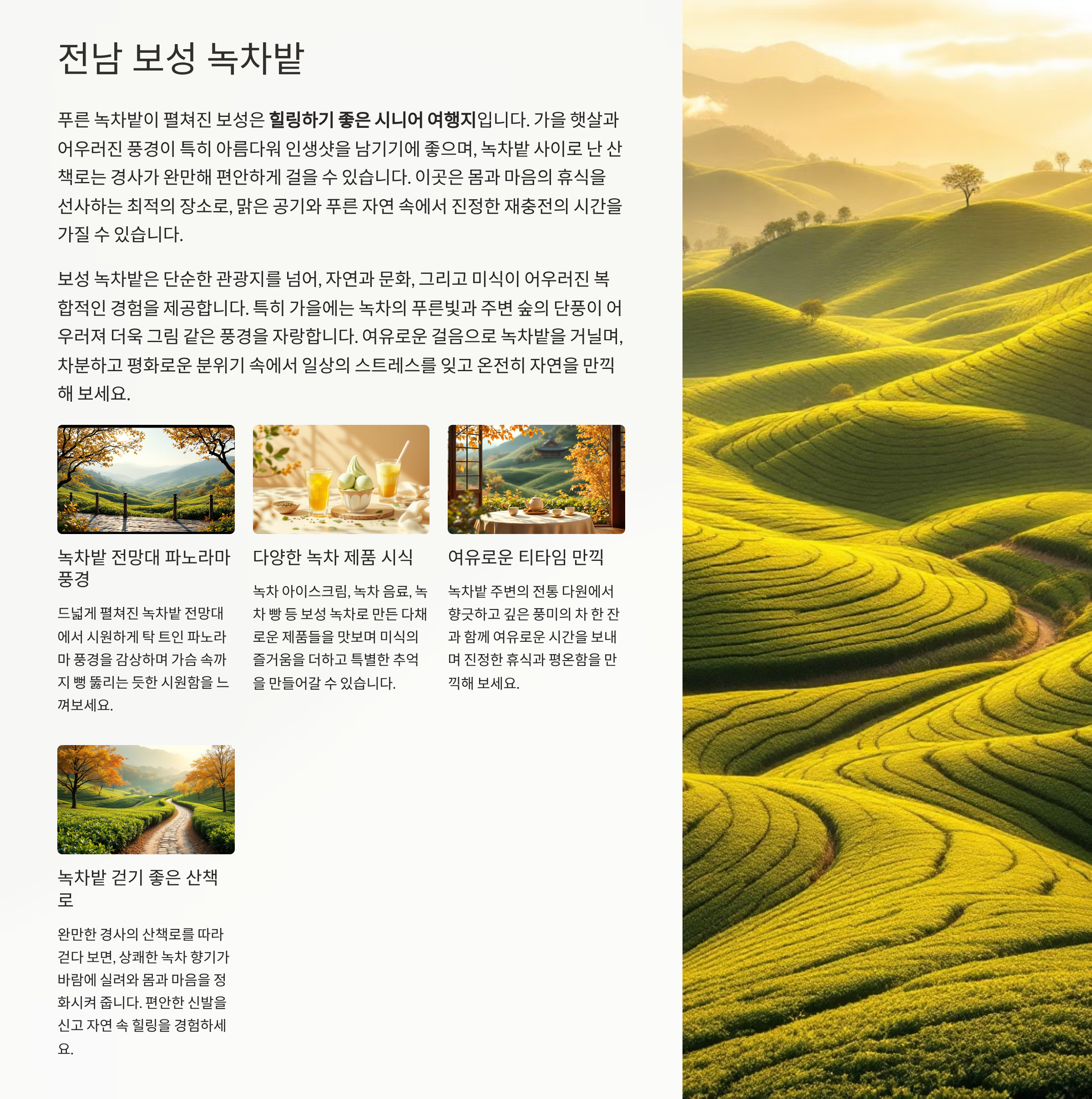 - 추천 키워드: 보성 녹차밭, 가을 힐링 여행지