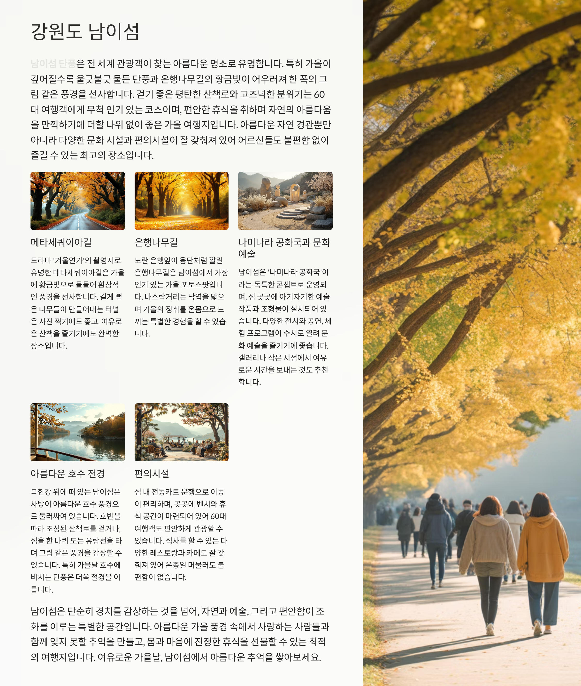 - 추천 키워드: 남이섬 여행, 가을 데이트 코스