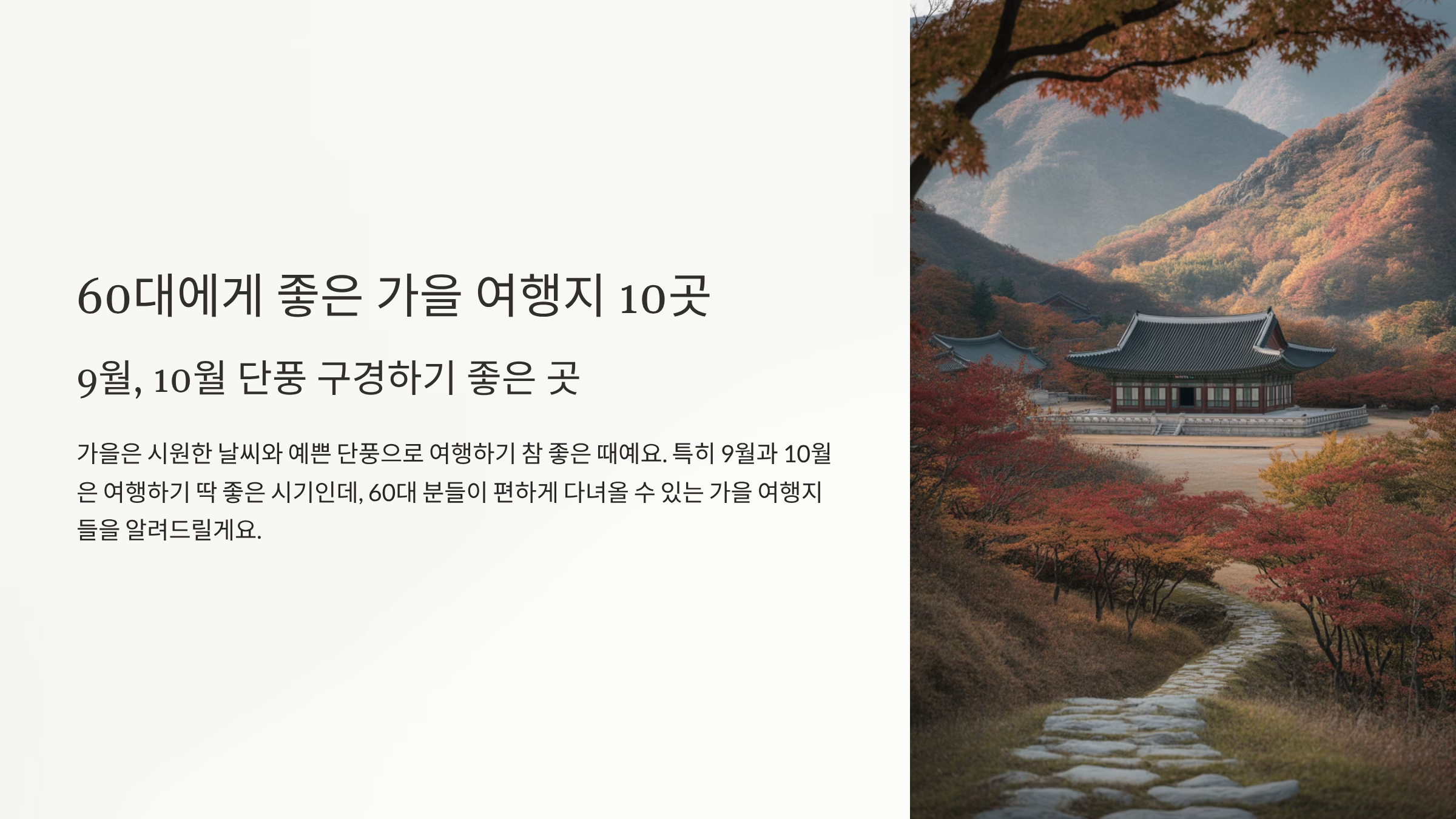 특히 9월과 10월은 여행의 황금기로, 60대 여행지로 적합한 곳들이 많습니다.
